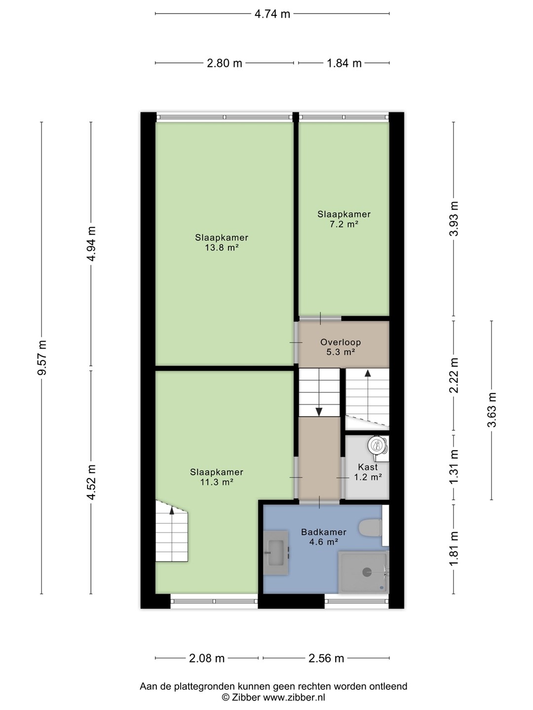 Vanaf de keuken leidt een trapopgang naar de overloop. Deze biedt toegang tot twee slaapkamers, beide gelegen aan de achterzijde van de woning. De kamers hebben een oppervlakte van circa 13,8 m² en 7,2 m² en zijn geschikt als respectievelijk hoofdslaapkamer en kinder- of werkkamer. De grootste slaapkamer is voorzien van een airco die tevens kan verwarmen.