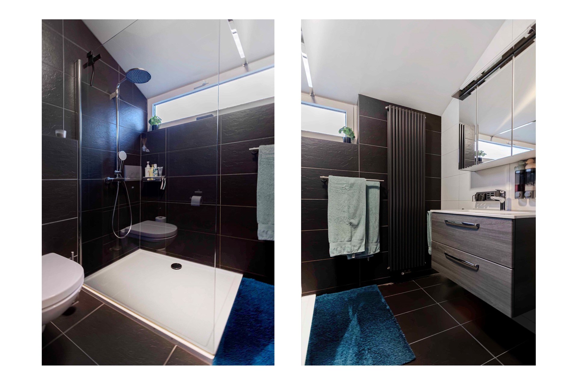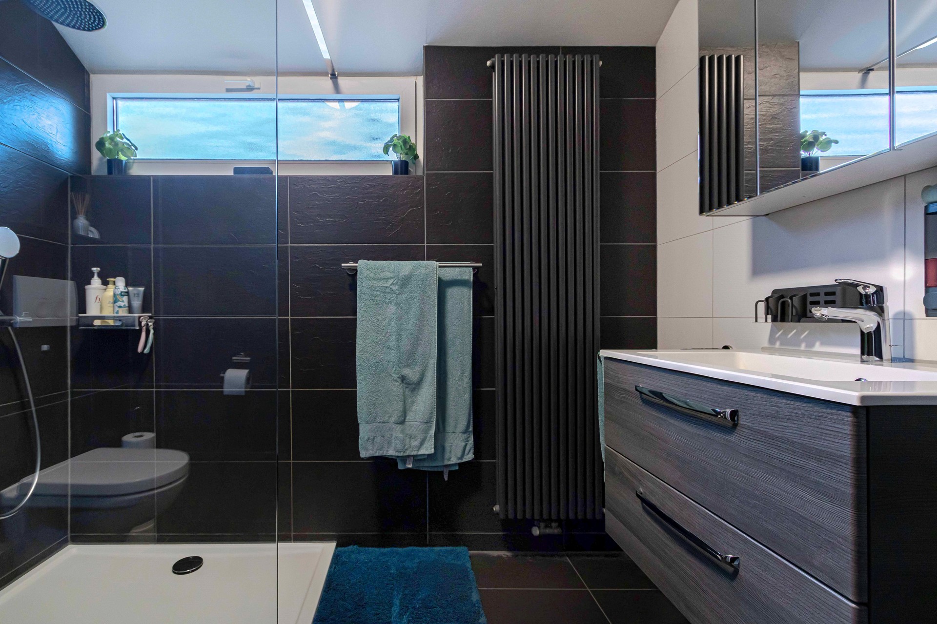 De badkamer is volledig betegeld, voorzien van een raam voor natuurlijke ventilatie en daglicht, en uitgerust met een regendouche met glazen wand, een tweede zwevend toilet, een wastafelmeubel met spiegelkast en een designradiator.