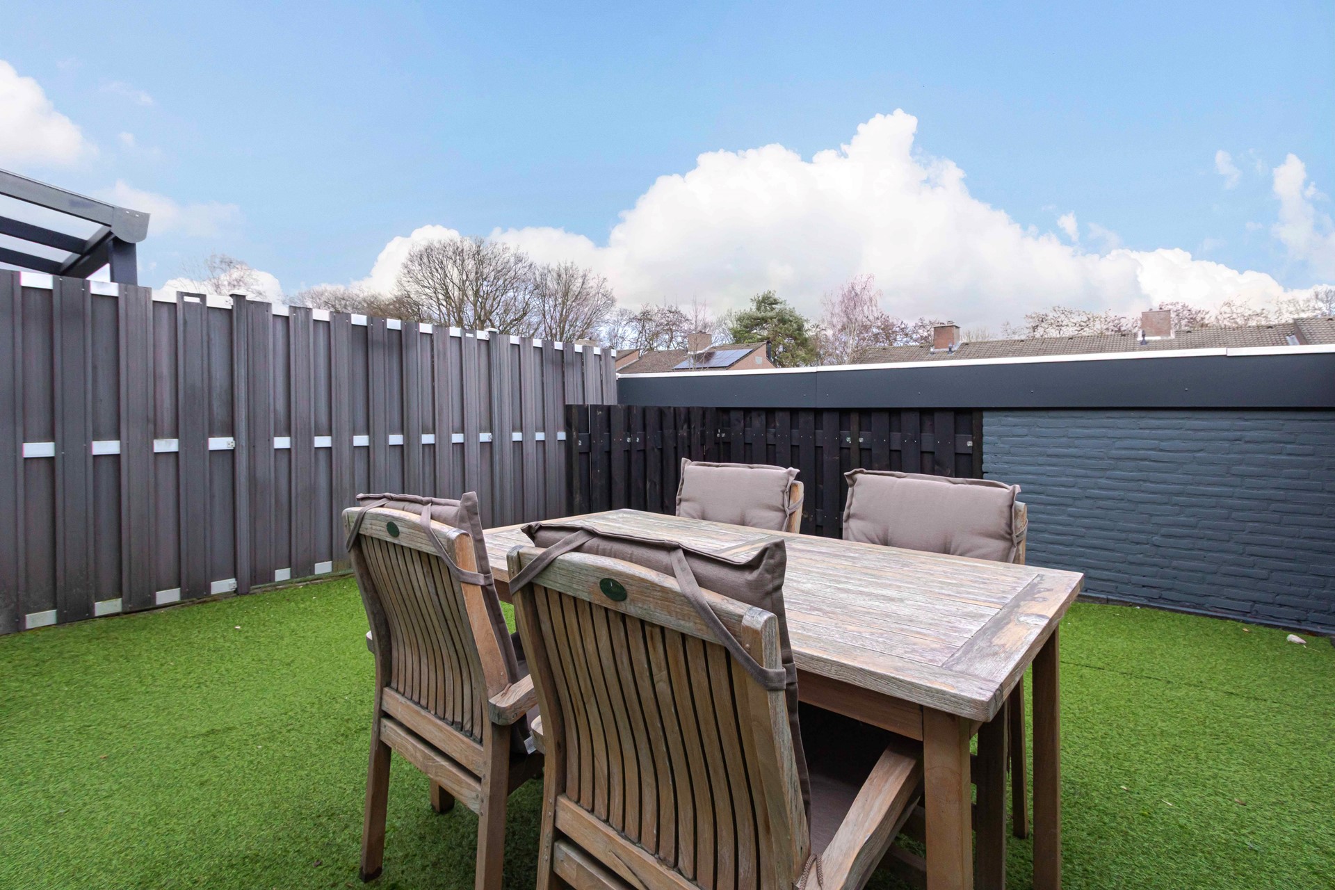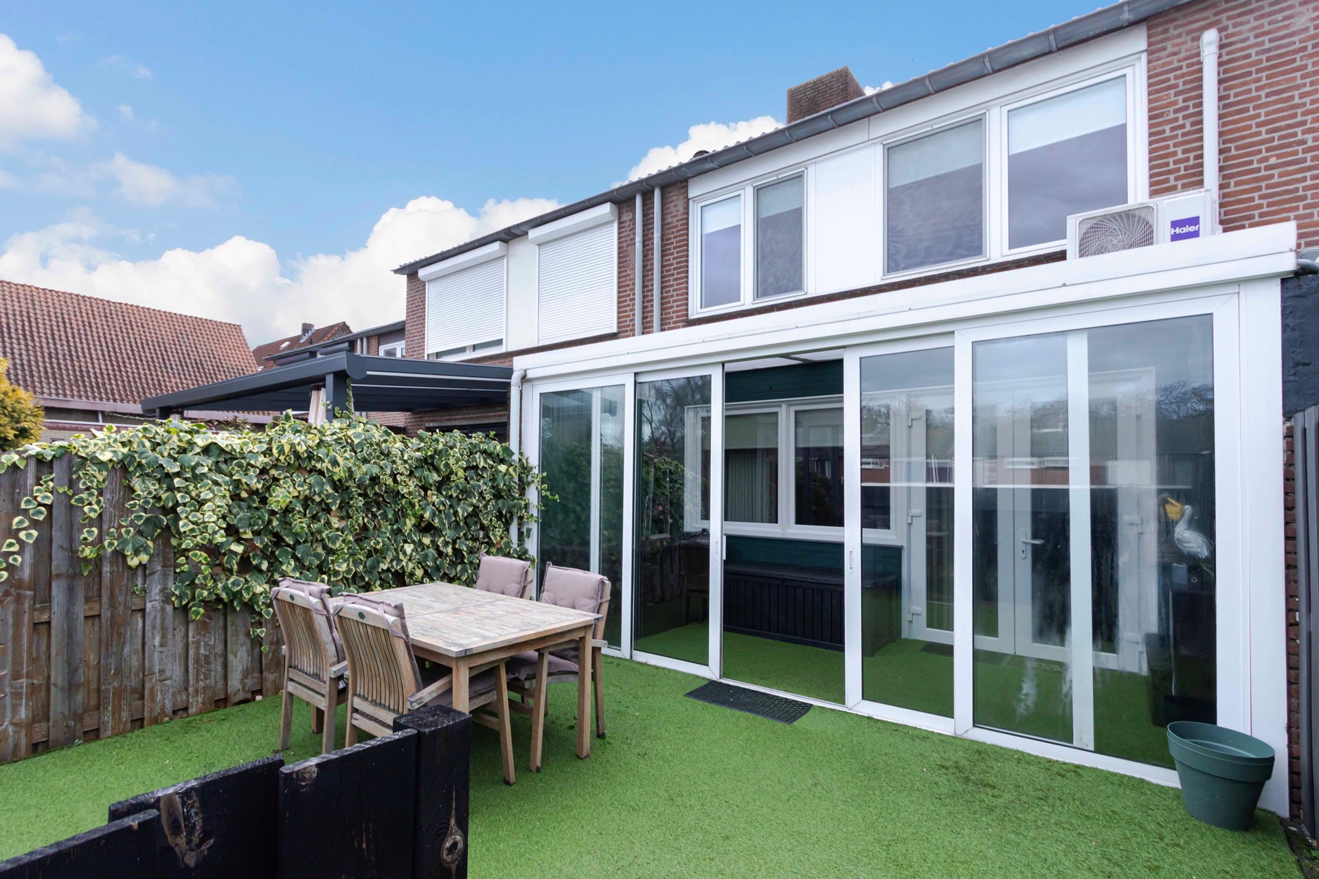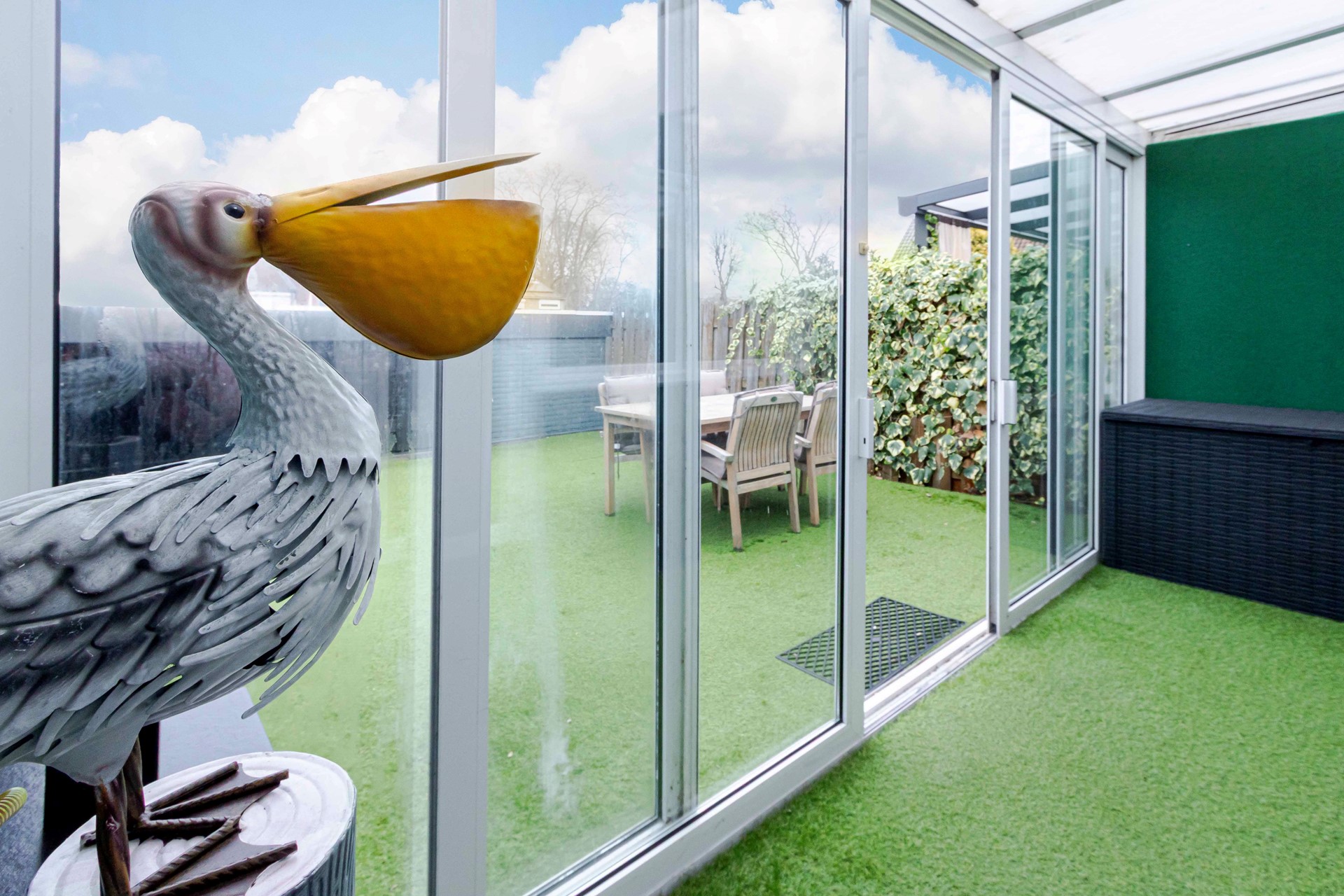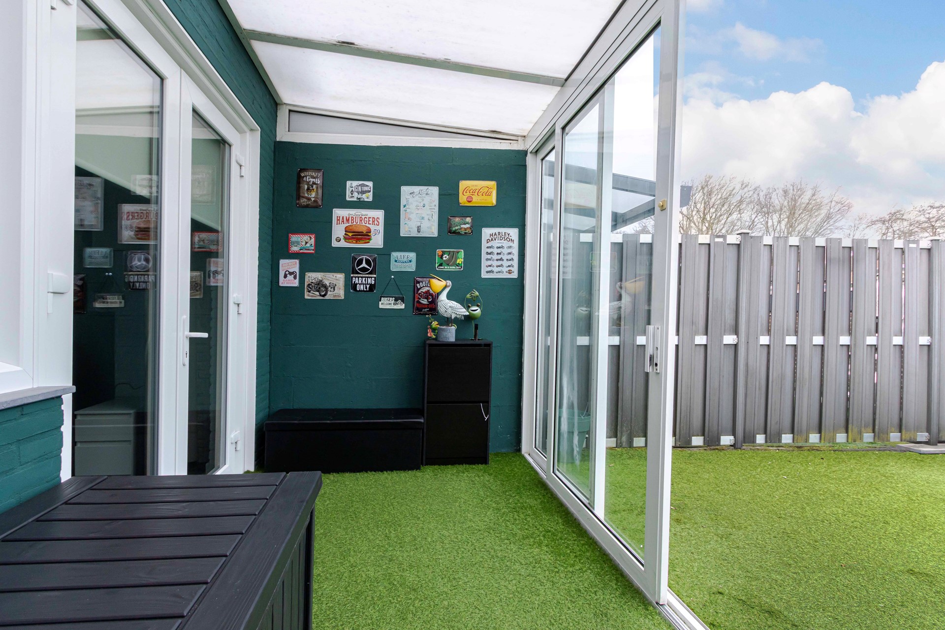 De achtertuin ligt op het noordwesten en is ingericht met onderhoudsvriendelijk kunstgras. Hierdoor oogt zowel de serre als de tuin zelf het hele jaar door groen en verzorgd.