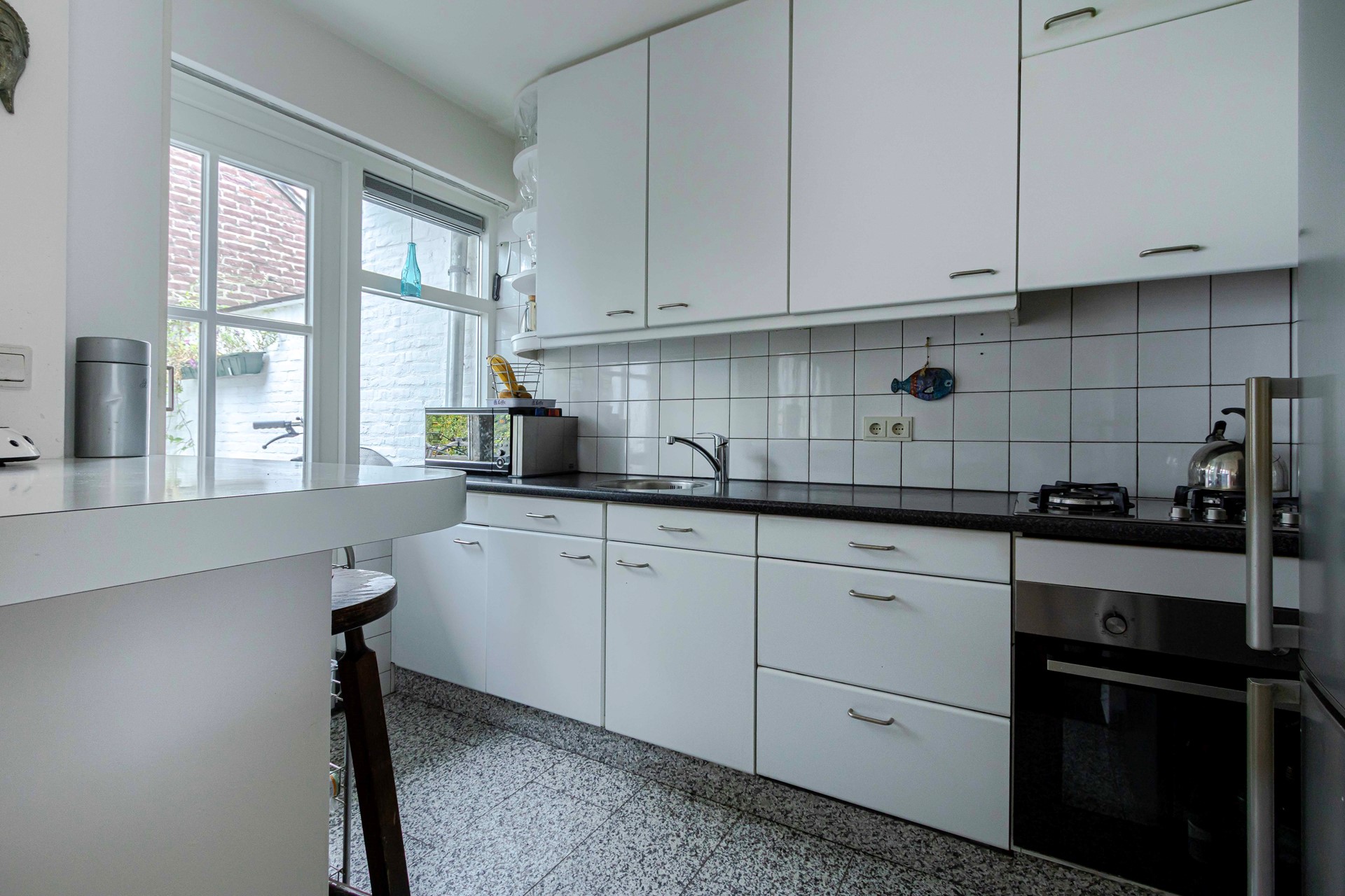 We stappen binnen in de hal, waar direct het nette, volledig betegelde toilet met zwevend closet te vinden is. Vanuit hier lopen we door naar de woonkamer, die meteen een warme indruk maakt dankzij de gezellige erker aan de voorzijde. De lamelparketvloer en de open haard versterken dat sfeervolle gevoel. Aansluitend ligt de halfopen keuken, uitgevoerd met een praktische tegelvloer en voorzien van een 4-pits gaskookplaat, afzuiginstallatie, oven en een vaatwasser. In de hal bevinden zich verder de deur naar de kelder en de meterkast met stoppen.