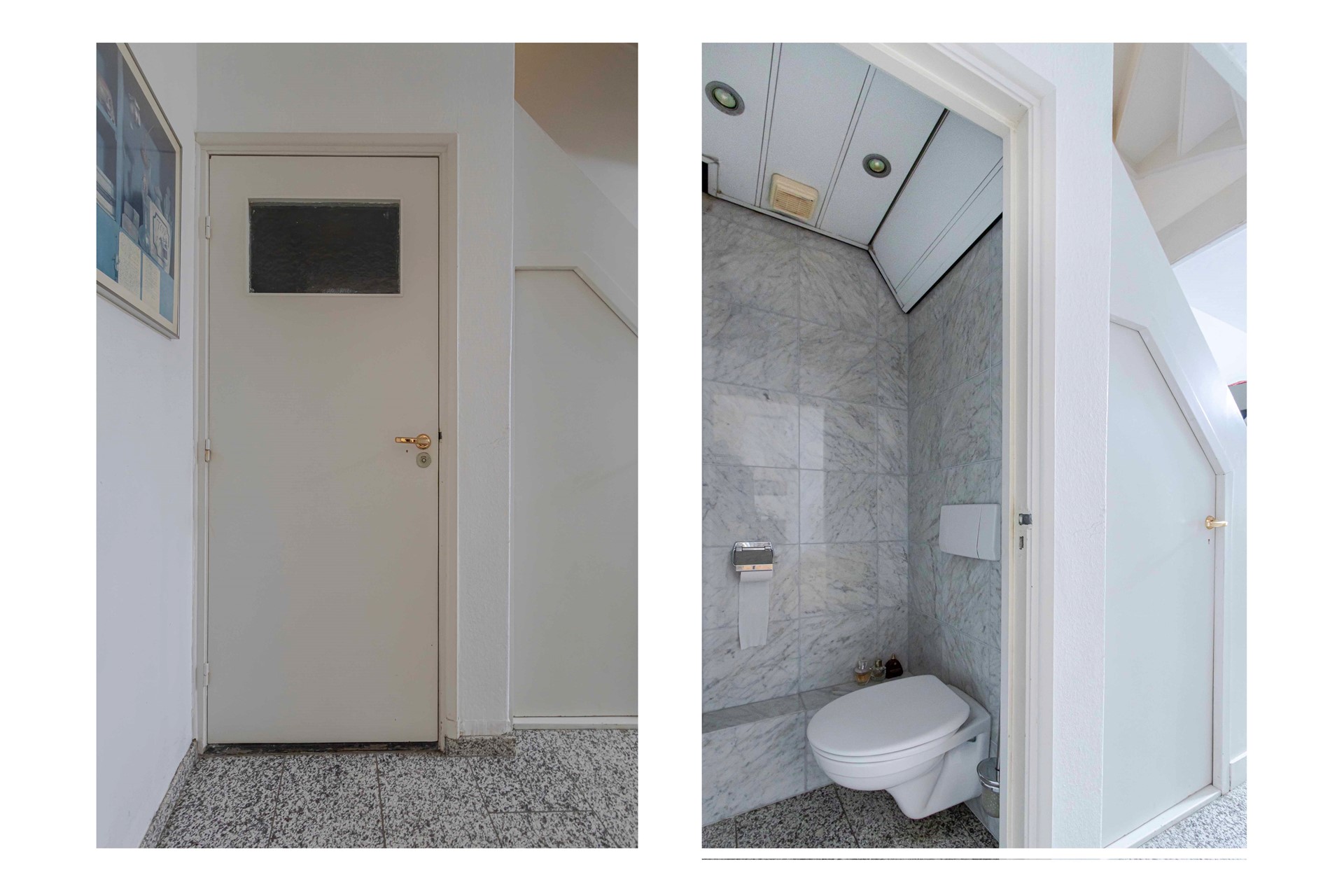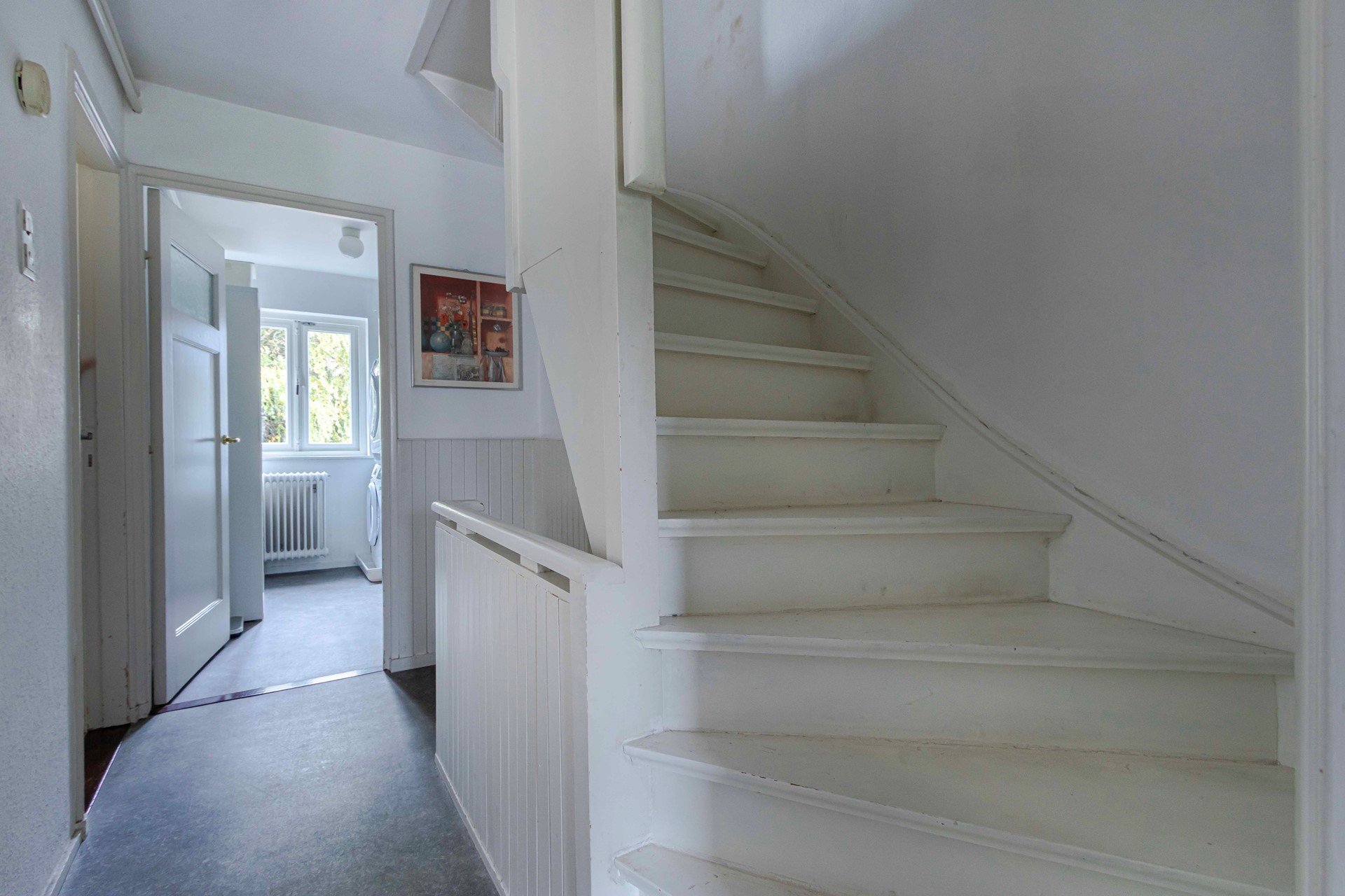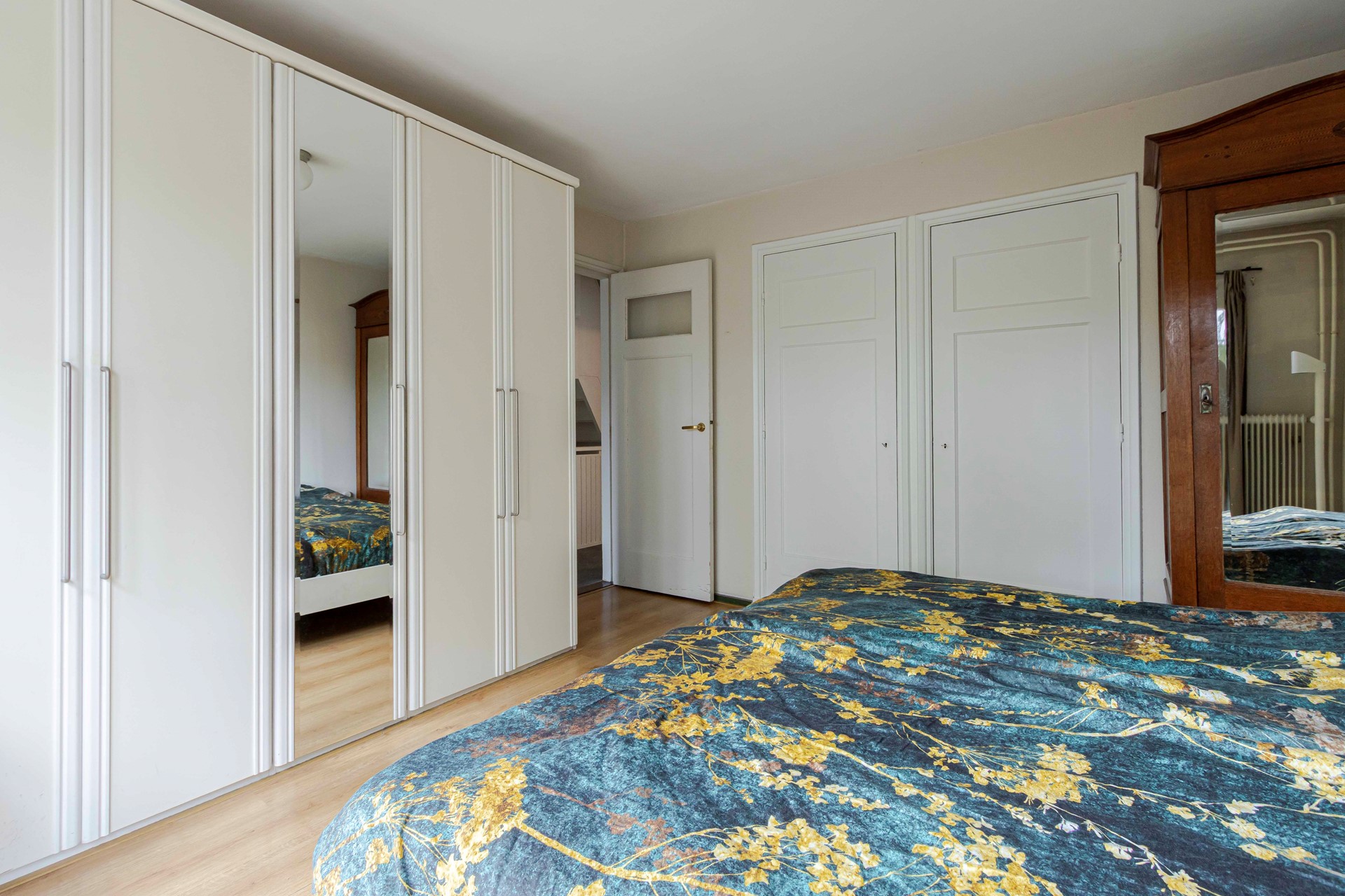 We lopen de trap op naar de eerste verdieping, waar twee royale slaapkamers te vinden zijn. De kamer aan de voorzijde meet 3,75 x 3,30 meter en de kamer aan de achterzijde 3,75 x 3,54 meter. Beide kamers beschikken over praktische inbouwkasten en een laminaatvloer. Aan de achterzijde openen dubbele deuren naar het balkon, dat zich over de volledige breedte van de woning uitstrekt en recent is gerenoveerd. De paneeldeuren op deze verdieping geven alles die herkenbare jaren-50 uitstraling.