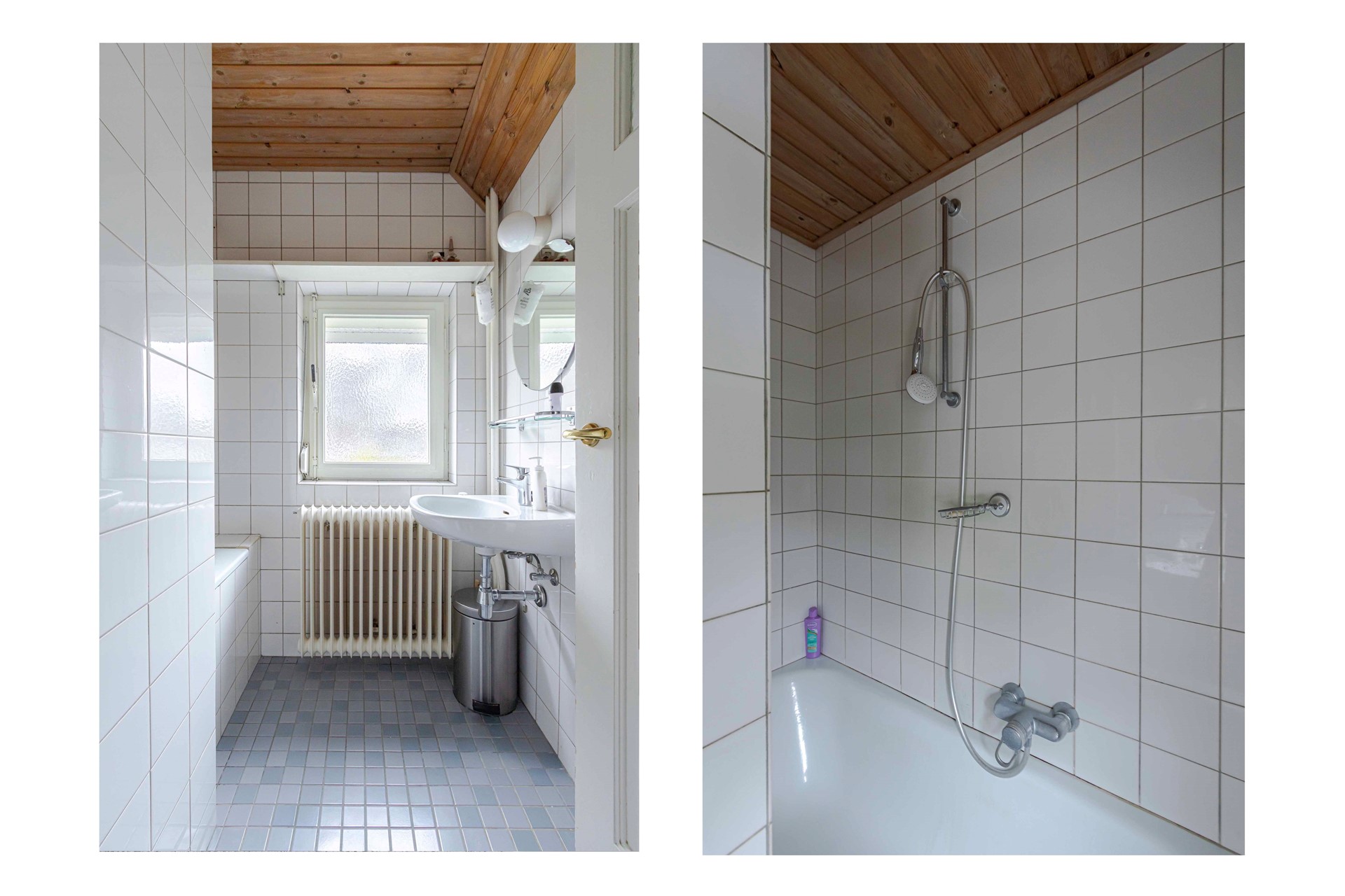 Achter op de verdieping ligt ook een kleinere kamer van 2,60 x 1,84 meter, momenteel in gebruik als wasruimte met een extra toilet. Aan de voorzijde bevindt zich de badkamer, ruim 3 m² groot, eenvoudig van afwerking en voorzien van een ligbad met douche, wastafel en een tegelvloer.