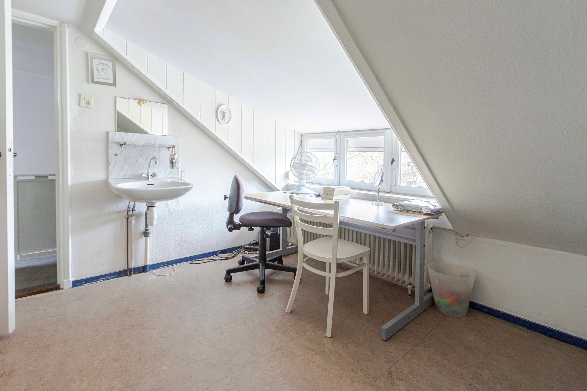 * op de eerste verdieping twee ruime slaapkamers en een kleinere kamer;
