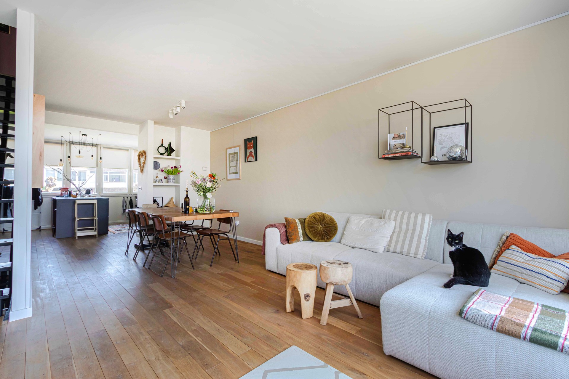De woonkamer biedt volop ruimte voor zowel een comfortabele zithoek als een royale eethoek en staat in directe verbinding met de keuken.
