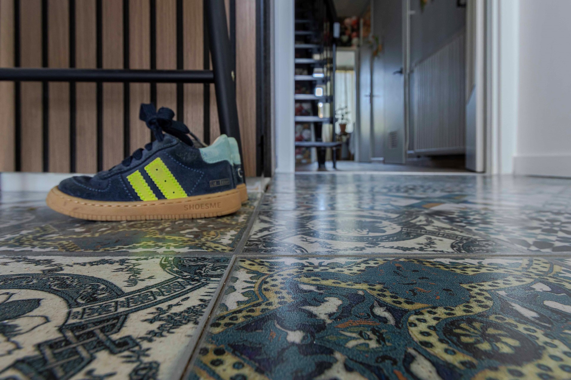 Via de entree kom je binnen in de hal, waar direct de sfeervolle Portugese tegelvloer opvalt. Hier bevinden zich tevens de meterkast (voorzien van modern schakelmateriaal) en de trapopgang naar de verdieping.