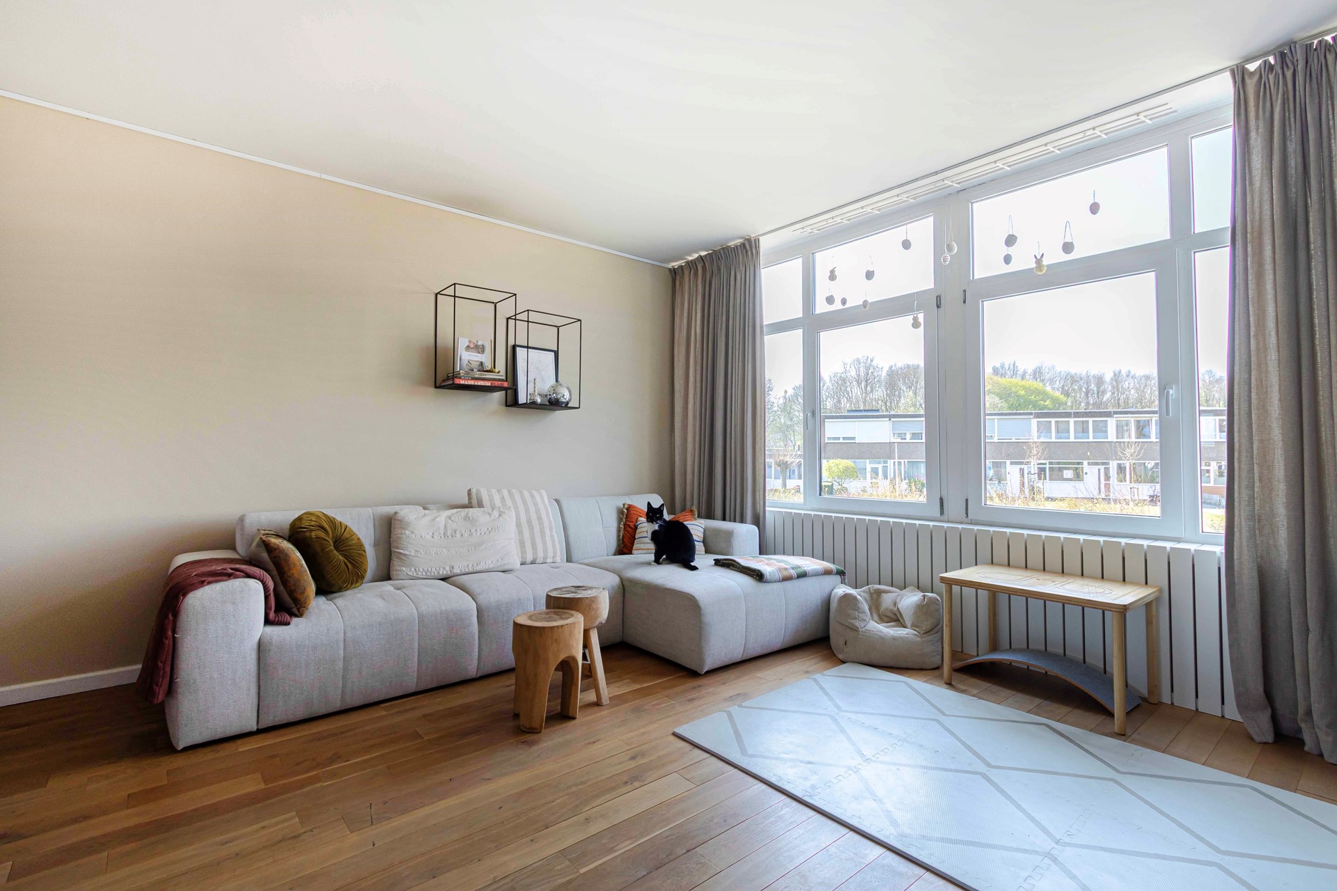 Op de eerste verdieping bevindt zich de ruime en lichte woonkamer, waar de grote raampartijen zorgen voor een prettige lichtinval en een open, ruimtelijk gevoel. De strak afgewerkte houten vloer geeft het geheel een warme en moderne uitstraling.