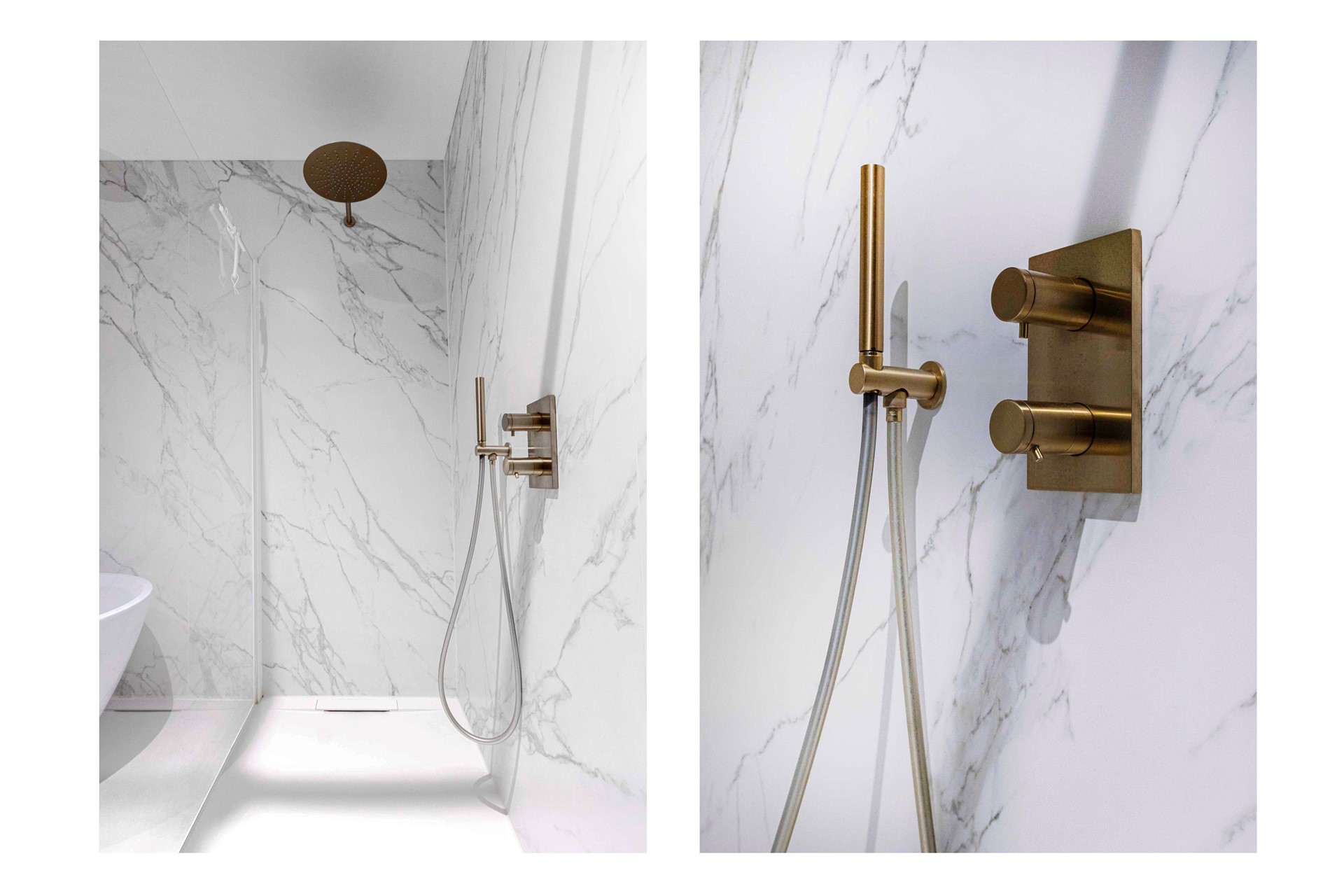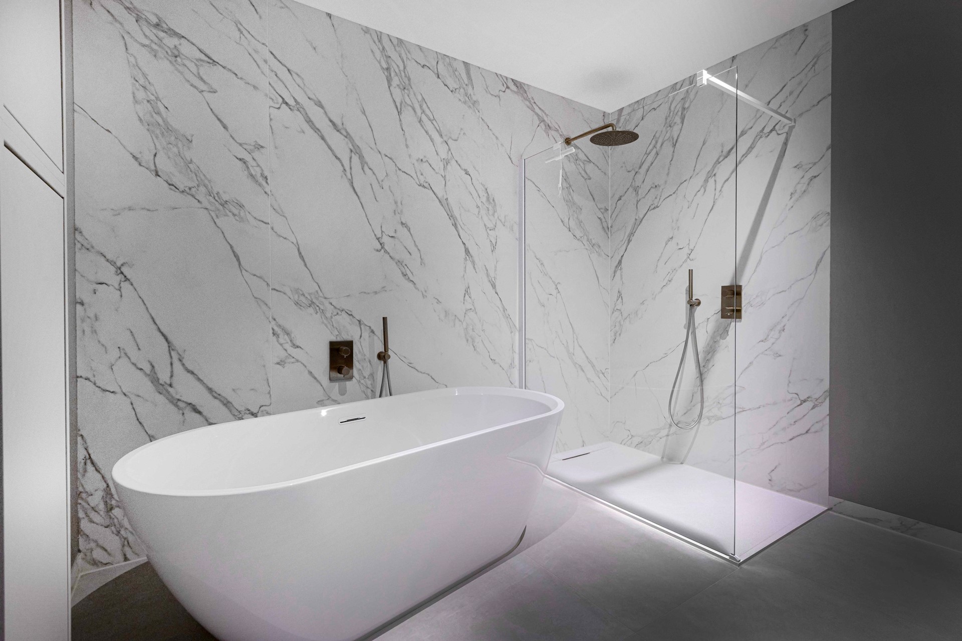 De moderne badkamer is uitgevoerd in neutrale tinten en hoogwaardig afgewerkt. De ruimte is voorzien van een wastafelmeubel met dubbele kraan en een stijlvolle visgraattegel als accentwand, een inloopdouche en ligbad.