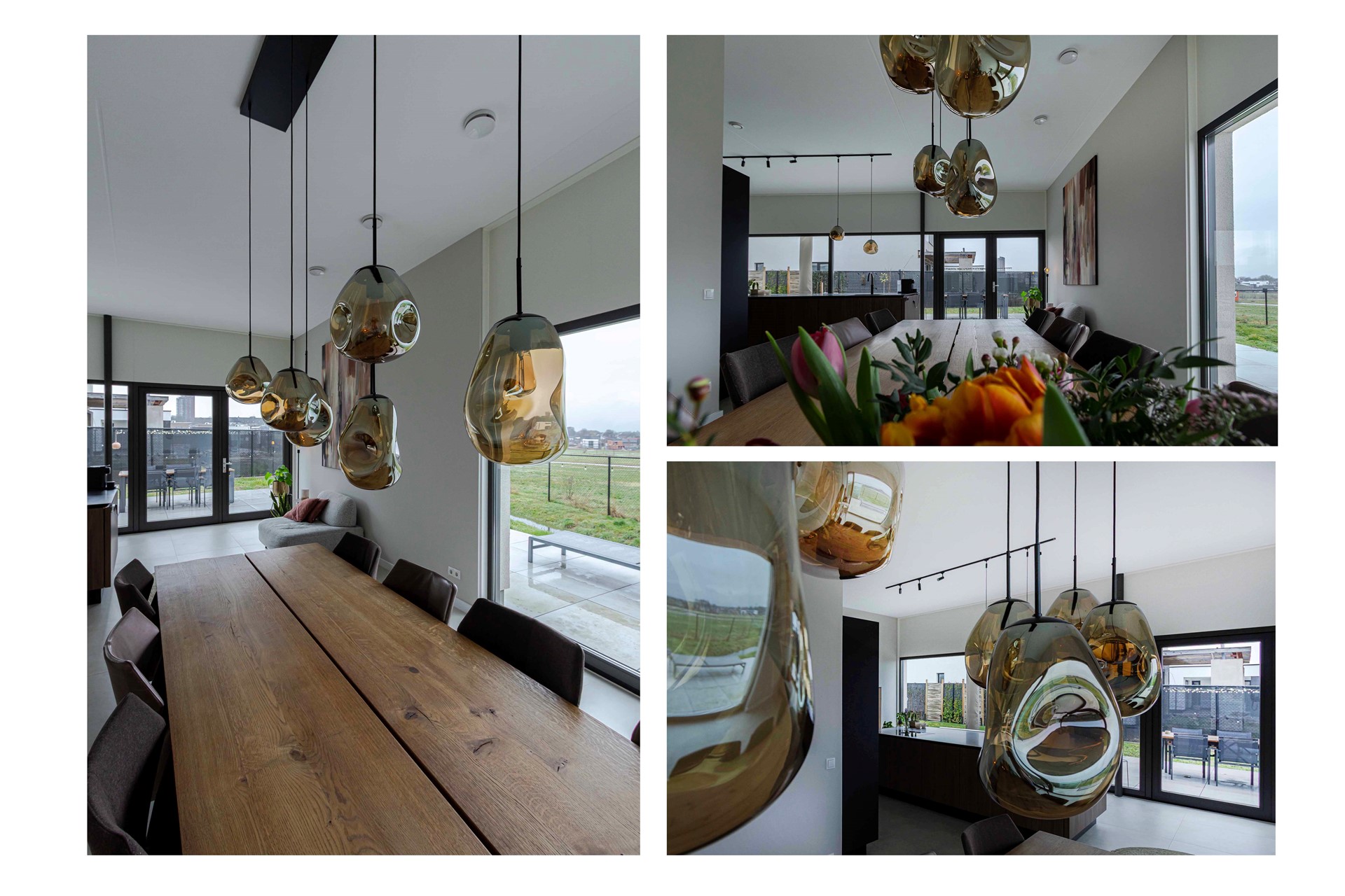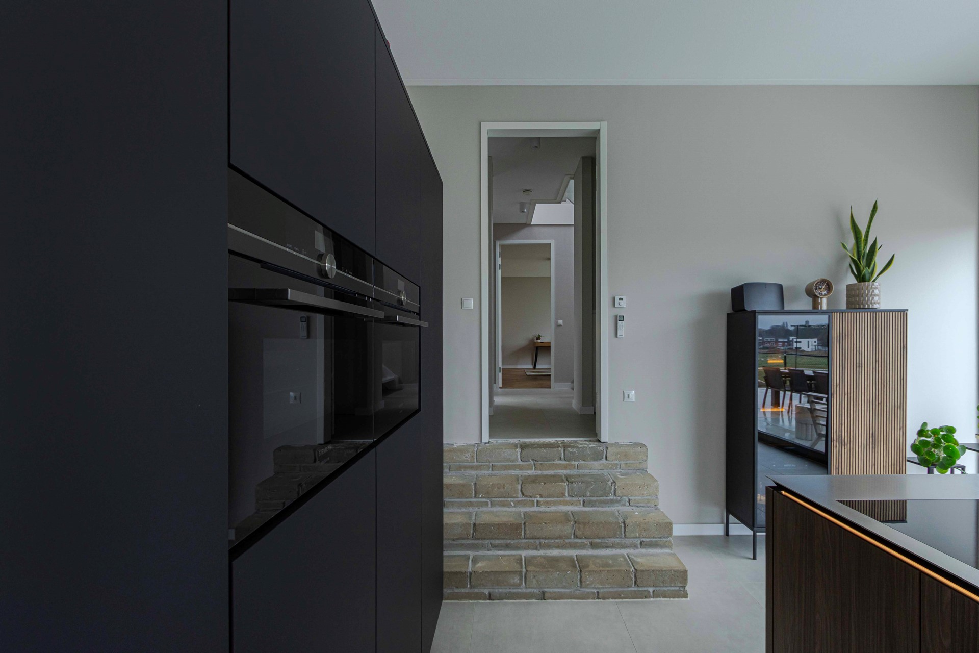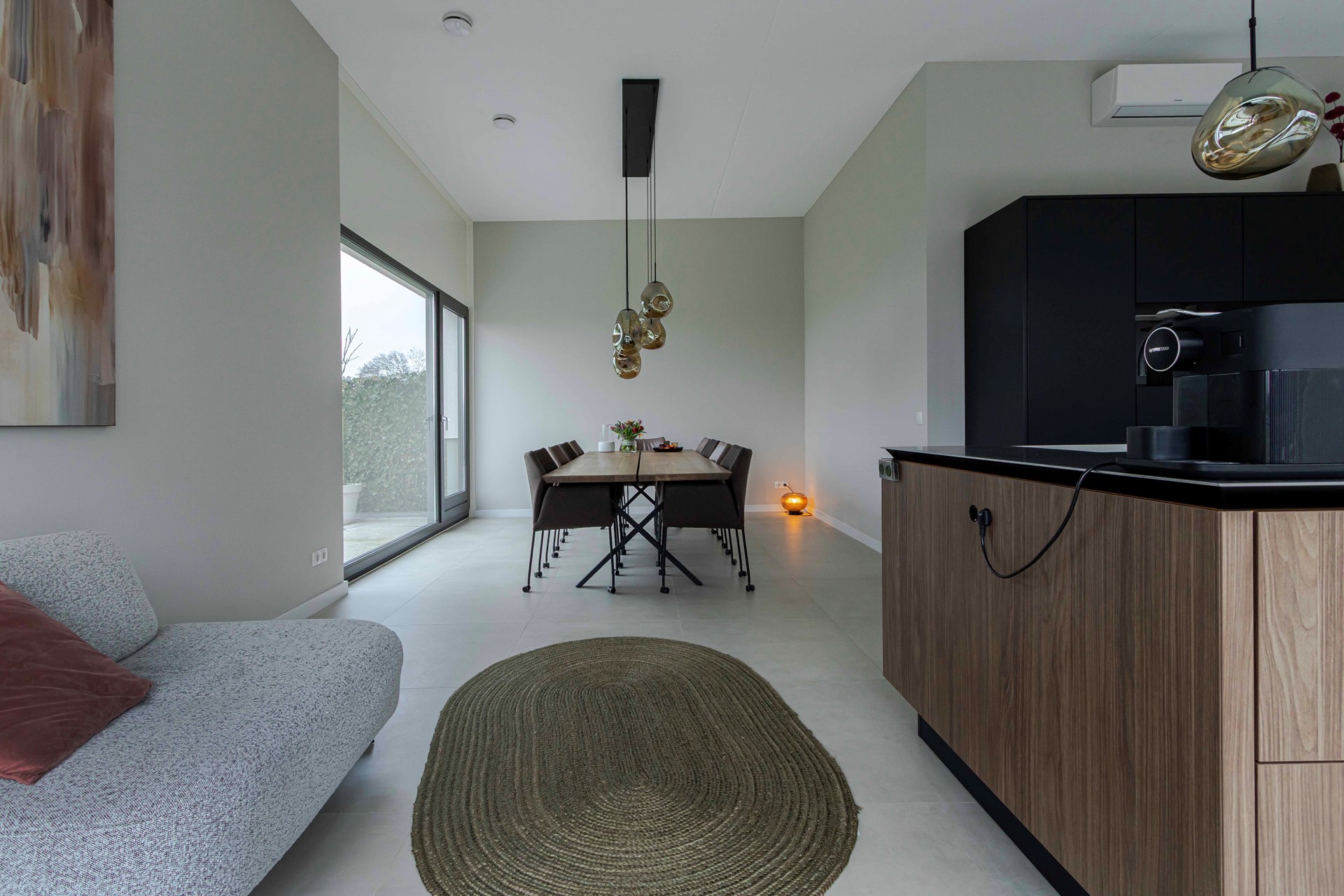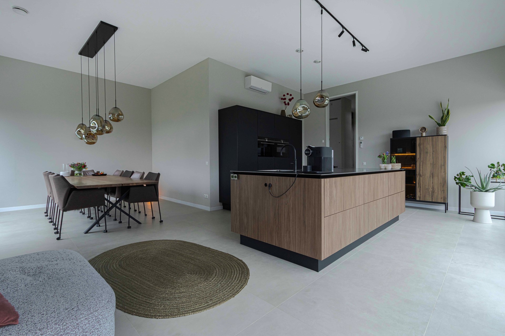 Via een subtiel hoogteverschil wordt de ruime leefkeuken met eetkamer bereikt, wat zorgt voor een speelse en ruimtelijke indeling met een eigen sfeerbeleving. Met een totaaloppervlakte van ca. 45 m² biedt deze leefruimte volop plaats om te koken, tafelen en samen te komen. De moderne keuken vormt een echte eyecatcher dankzij het stijlvolle kookeiland en de royale hoeveelheid opbergruimte. De keuken is uitgerust met luxe inbouwapparatuur, waaronder een Bora kookplaat, vaatwasser, koelkast, combi-stoomoven en een combi oven/magnetron. Daarnaast zorgen een Quooker met bruisend water en airconditioning voor extra comfort. De aangrenzende eetkamer is ruim opgezet en biedt dankzij de grote raampartijen een prachtig uitzicht over de achtertuin.