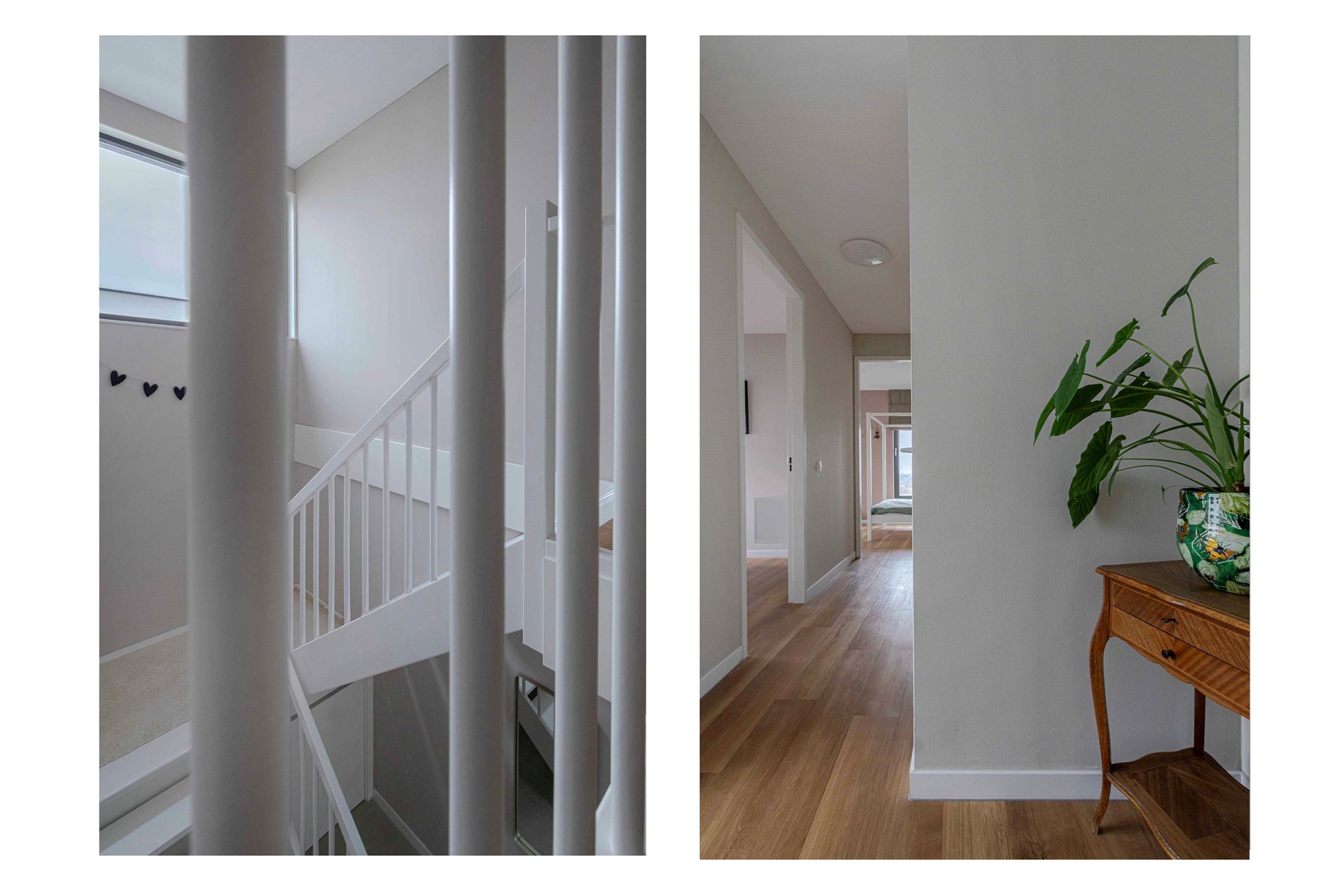 Via de trapopgang bereiken we de ruime overloop op de eerste verdieping. Vanuit hier zijn drie slaapkamers, de badkamer, een apart toilet en de technische ruimte bereikbaar. In de technische ruimte bevinden zich de warmtepomp en het WTW-systeem.