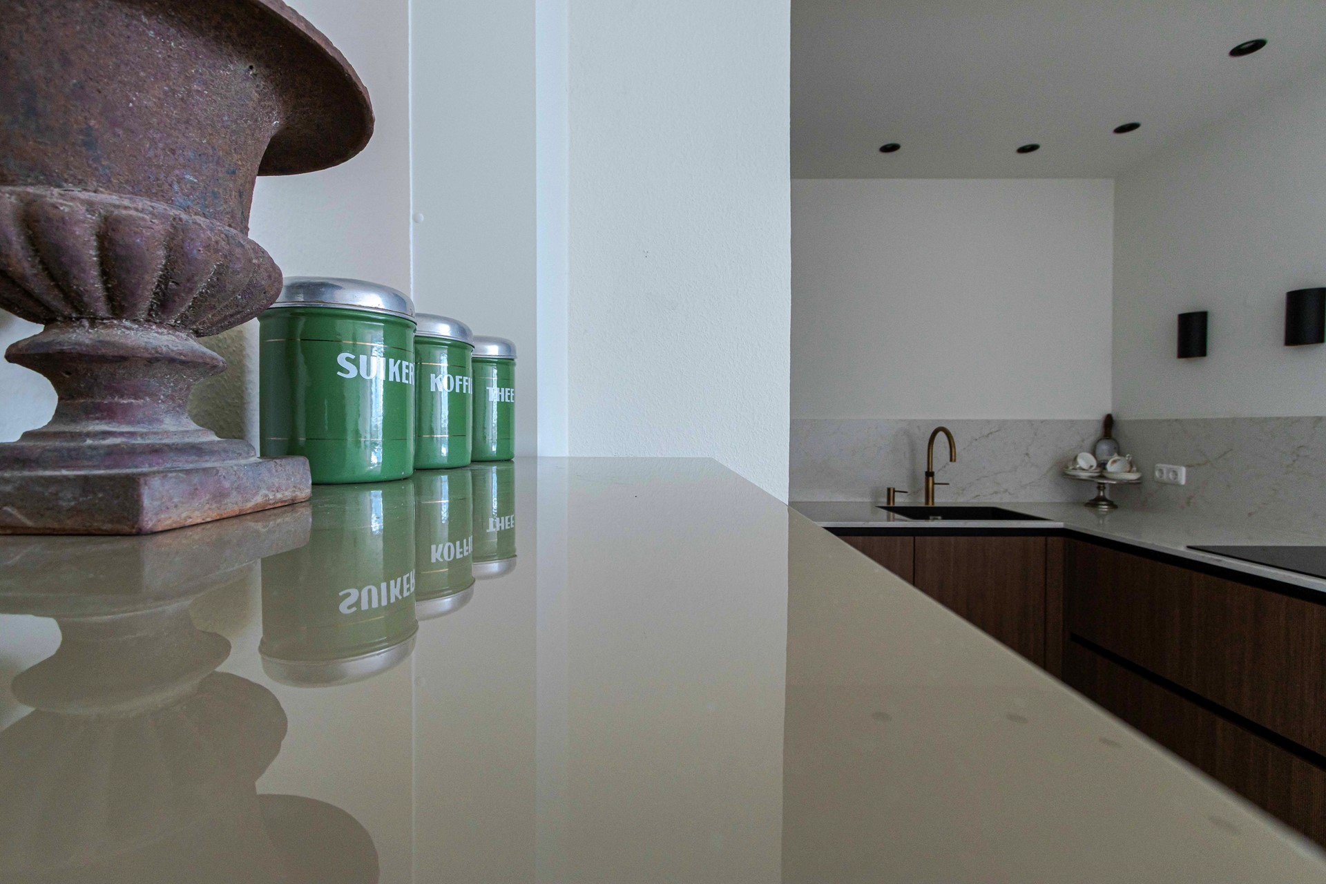 De luxe keuken van Au Four is uitgevoerd in een praktische hoekopstelling en voorzien van diverse hoogwaardige inbouwapparatuur, waaronder een koelkast, inductiekookplaat met geïntegreerde afzuiging en een combi-oven.