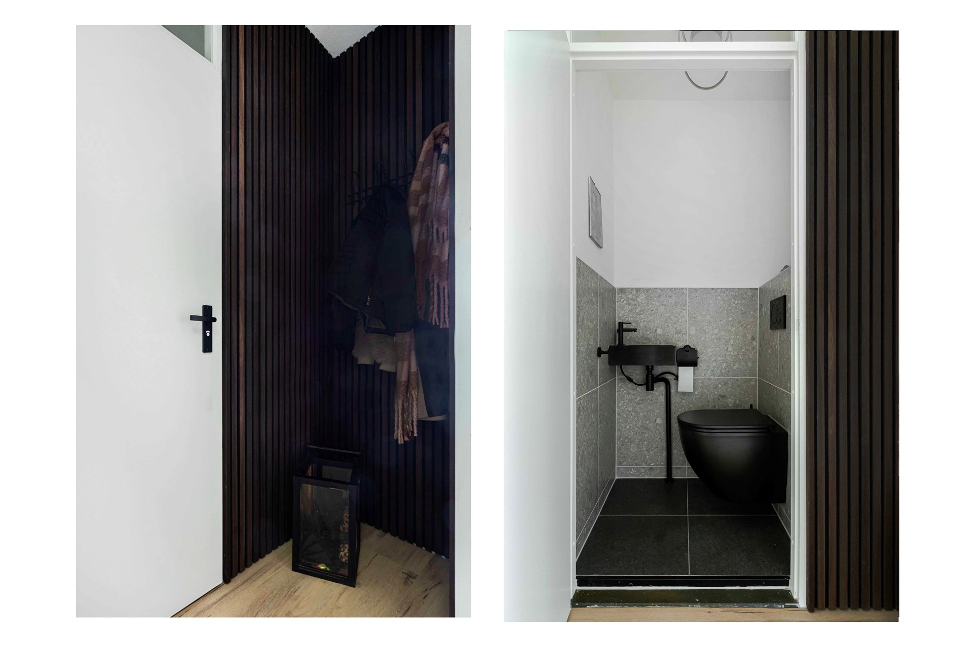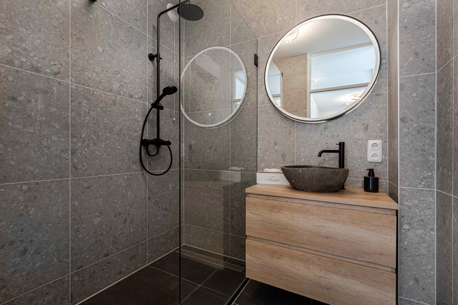 De badkamer is modern en luxe uitgevoerd en voorzien van een stijlvol badkamermeubel, ruime inloopdouche en elektrische designradiator. Ook de separate toiletruimte is in dezelfde hoogwaardige stijl afgewerkt.
