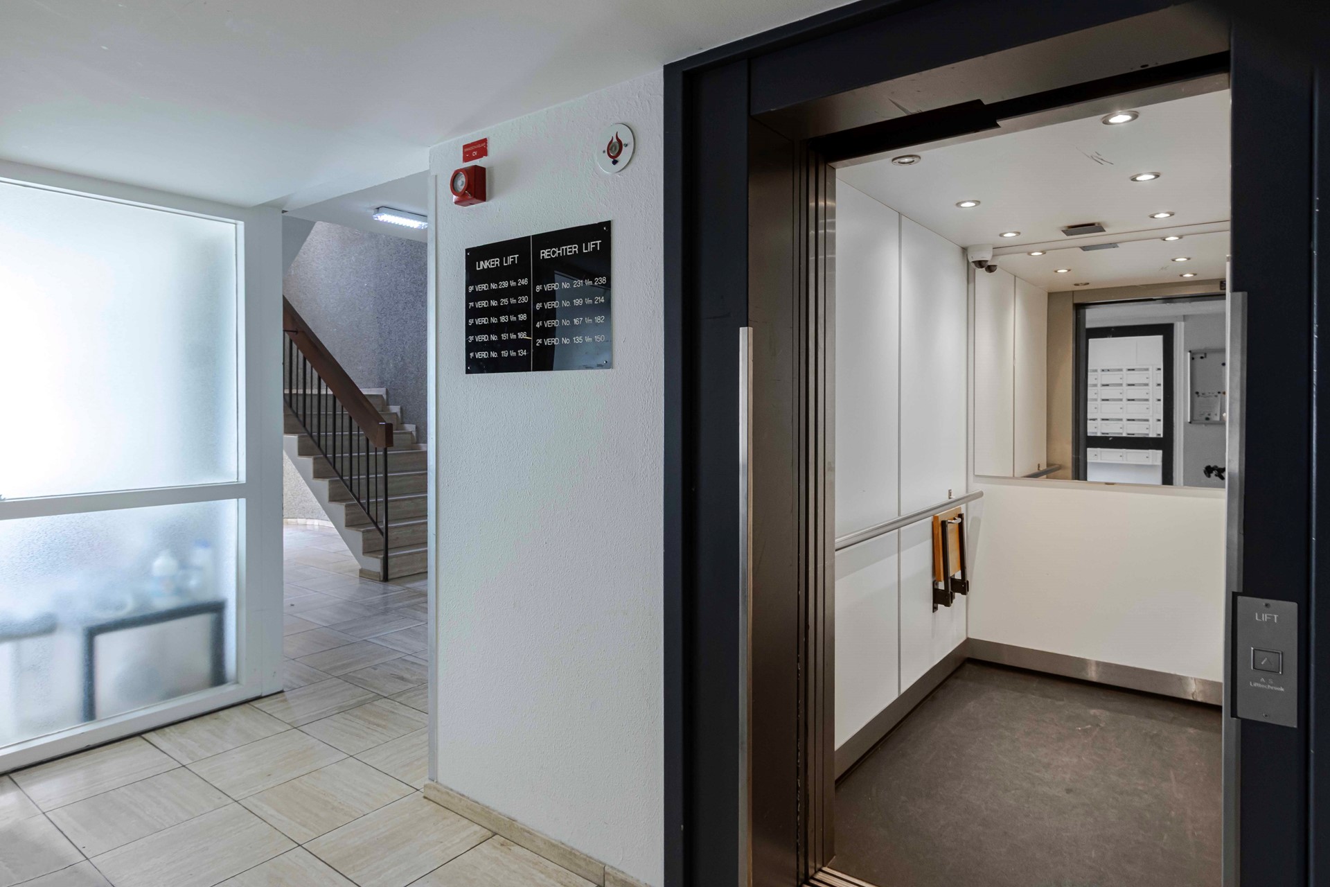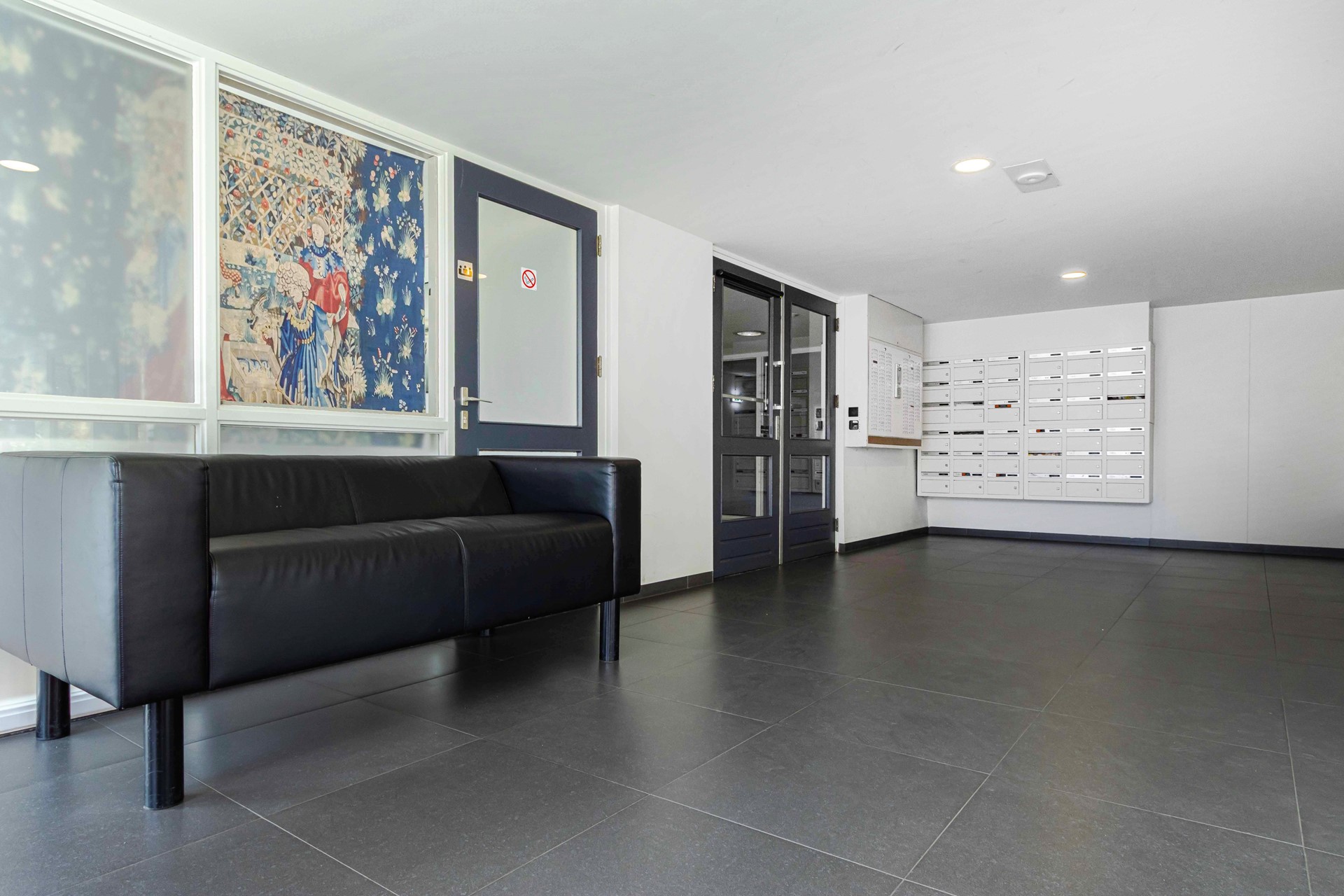 Representatieve centrale entreehal met brievenbussen, bellentableau, intercominstallatie, trappenhuis en liftinstallatie. Tevens bevindt zich op de begane grond een privé-berging