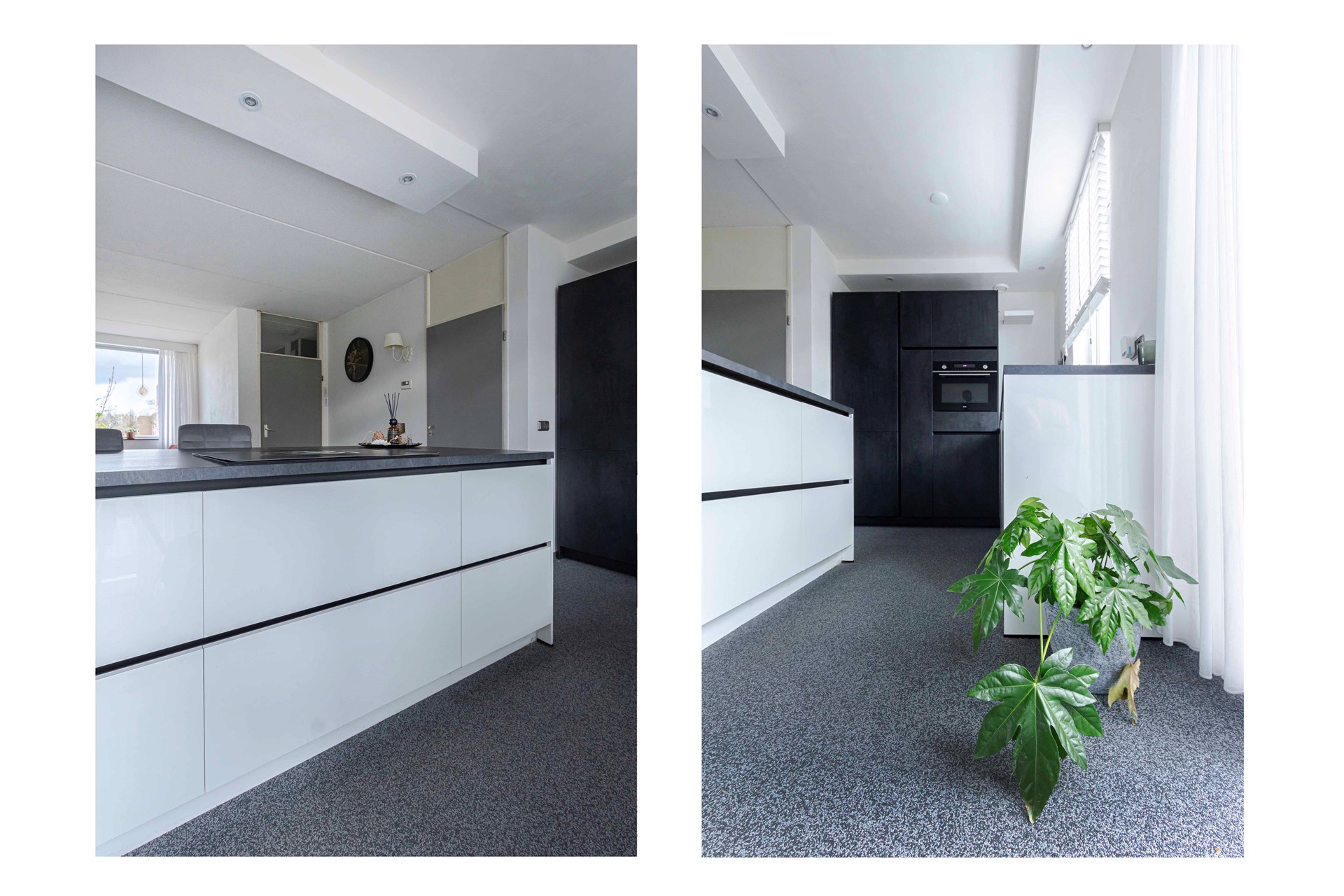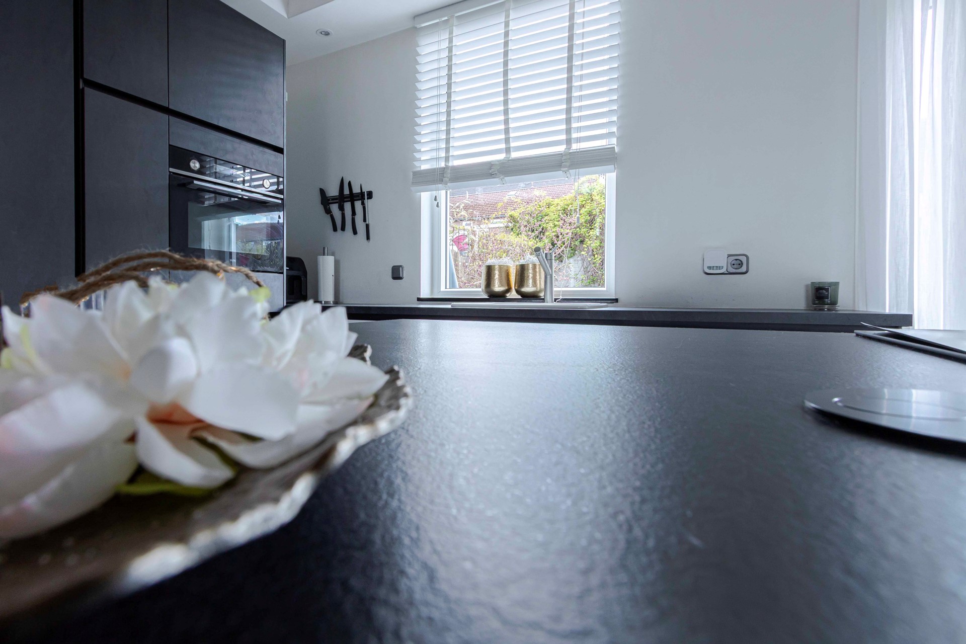 Aan de achterzijde bevindt zich de moderne keuken met kookeiland (2025). Het kookeiland beschikt over een gezellig zitgedeelte en vormt het hart van de woning. De keuken is uitgevoerd met een kunststof werkblad en voorzien van diverse inbouwapparatuur, waaronder een Bora inductiekookplaat, combimagnetron, vaatwasser, koelkast en diepvries. Vanuit de keuken is er directe toegang tot de achtertuin.