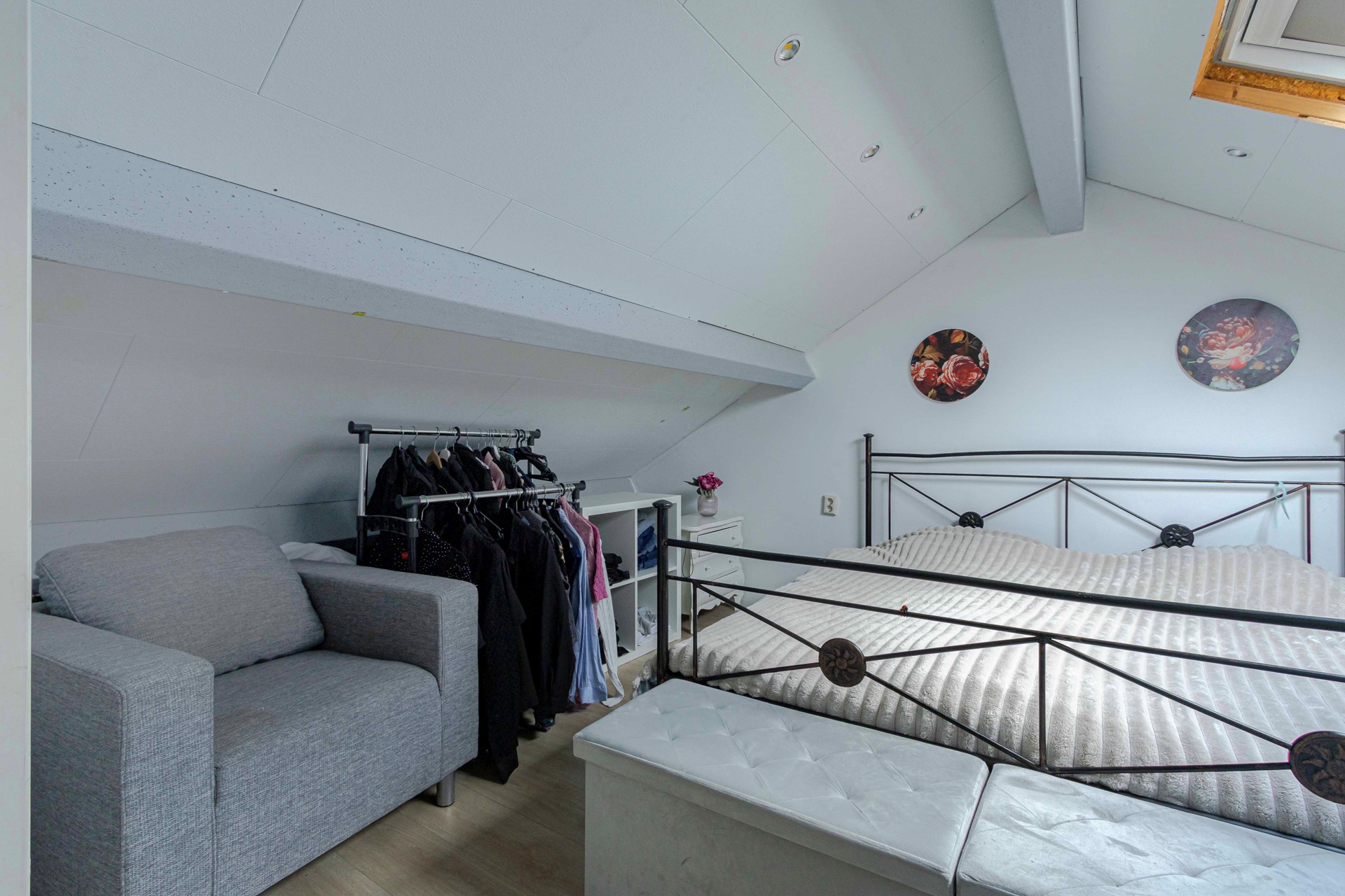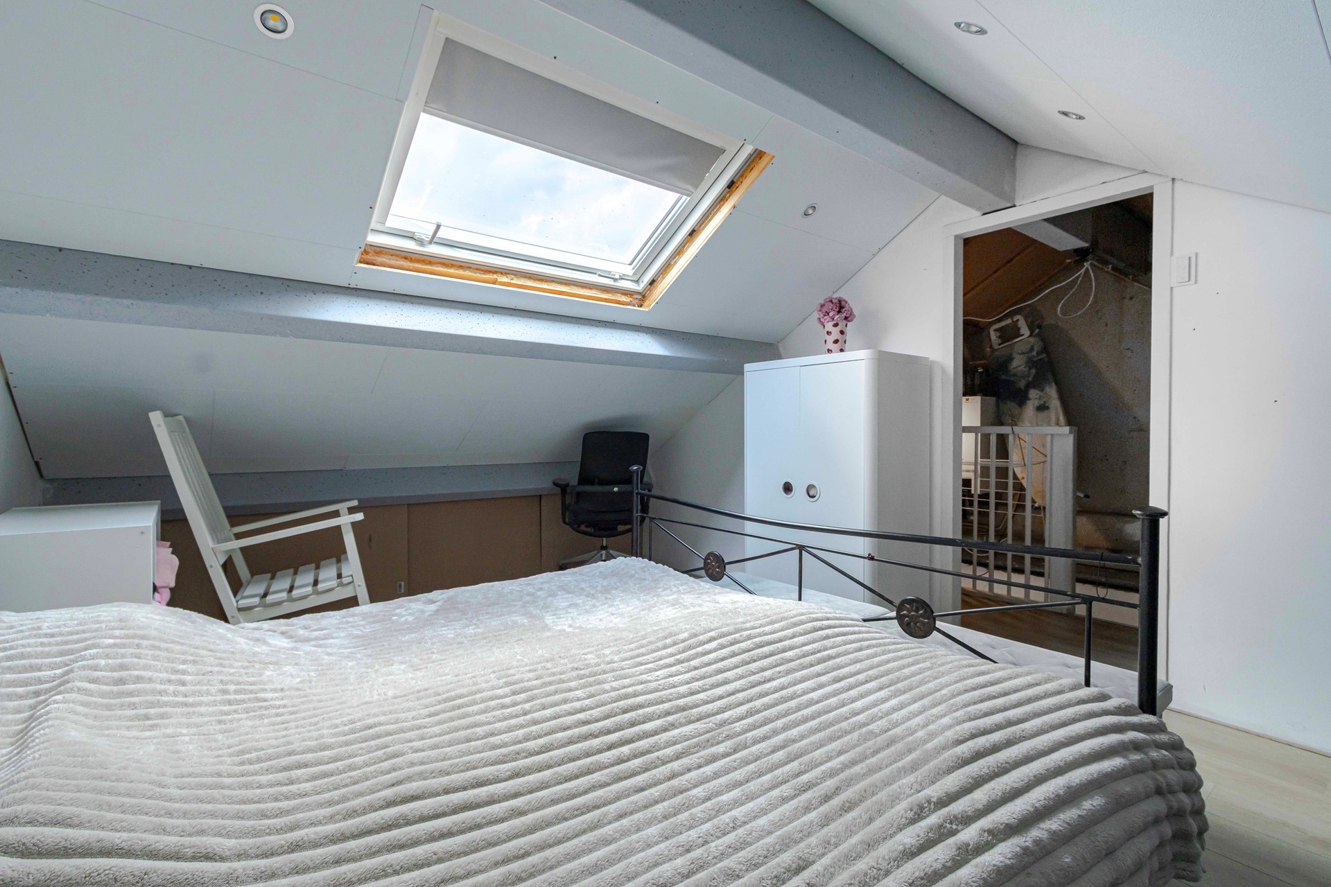 Via een vaste trapopgang bereiken we de overloop op de tweede verdieping. Hier bevindt zich de opstelplaats voor de cv-ketel en de wasmachine. Vanuit de overloop is de vierde slaapkamer bereikbaar, met een oppervlakte van ca. 10,5 m². Dankzij het grote dakraam is er prettig lichtinval, en de knieschotten zorgen voor praktische opbergruimte.