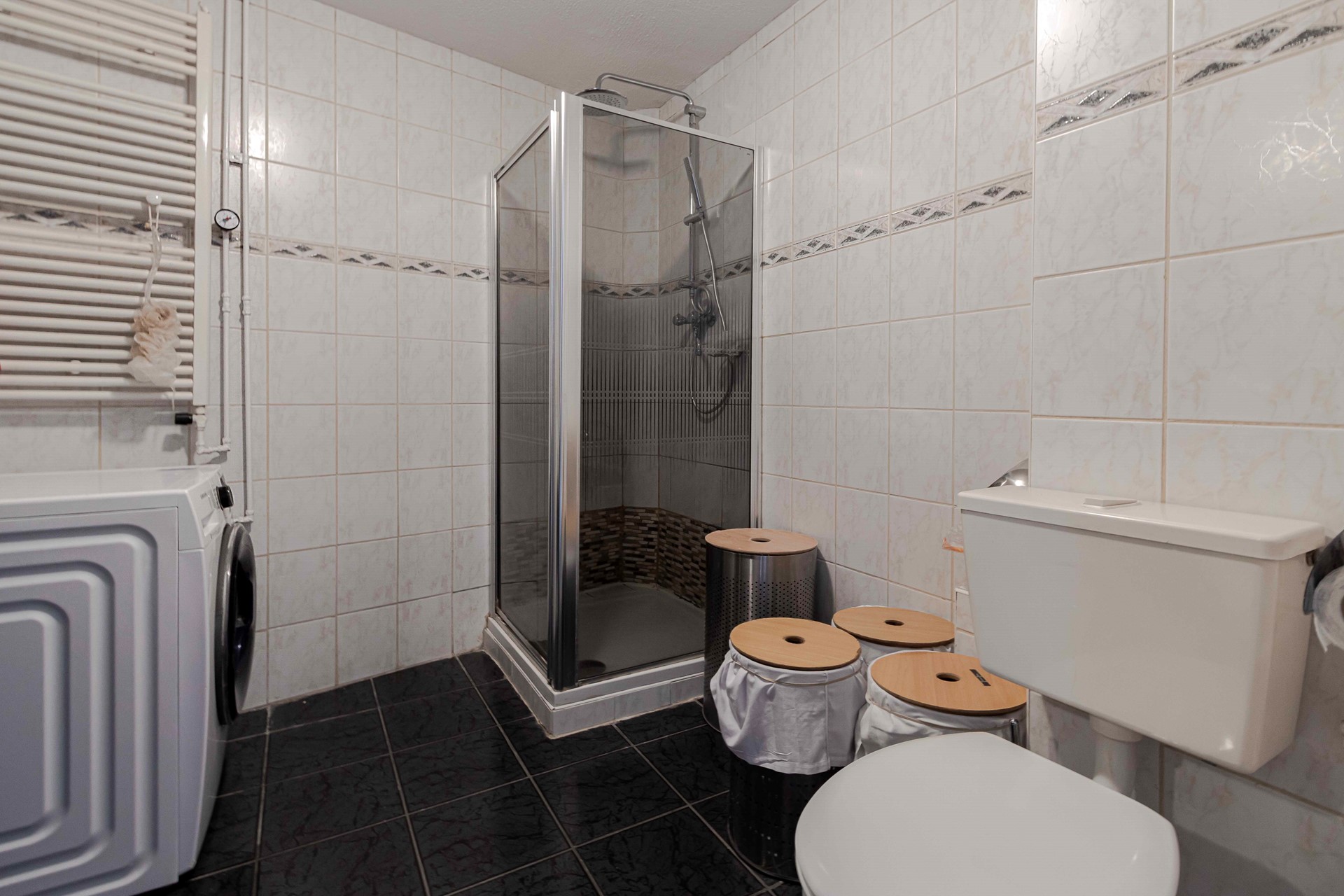 De badkamer is functioneel ingericht en voorzien van een tweede toilet, een wastafelmeubel, een douche en de aansluiting voor de wasmachine.