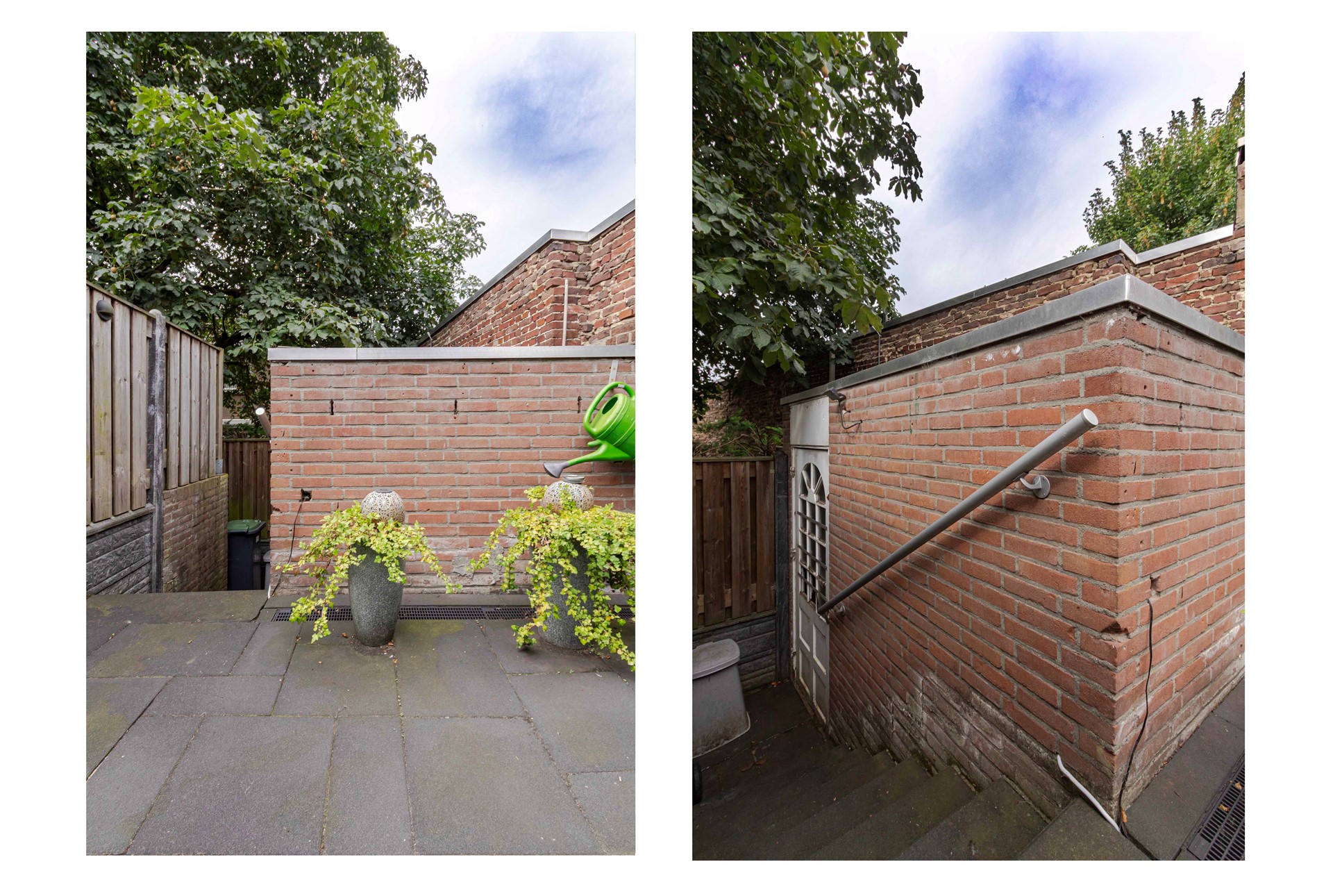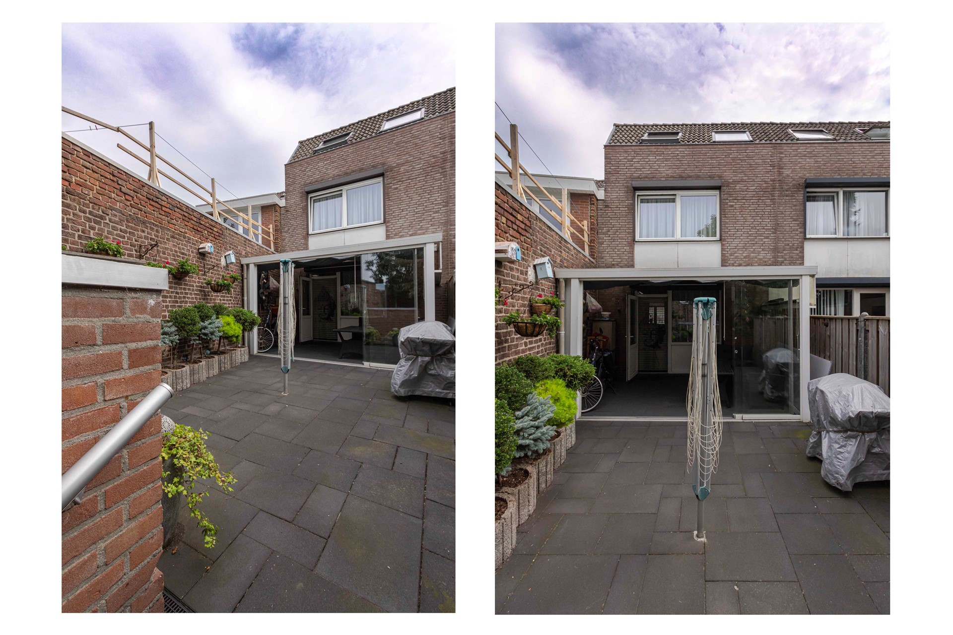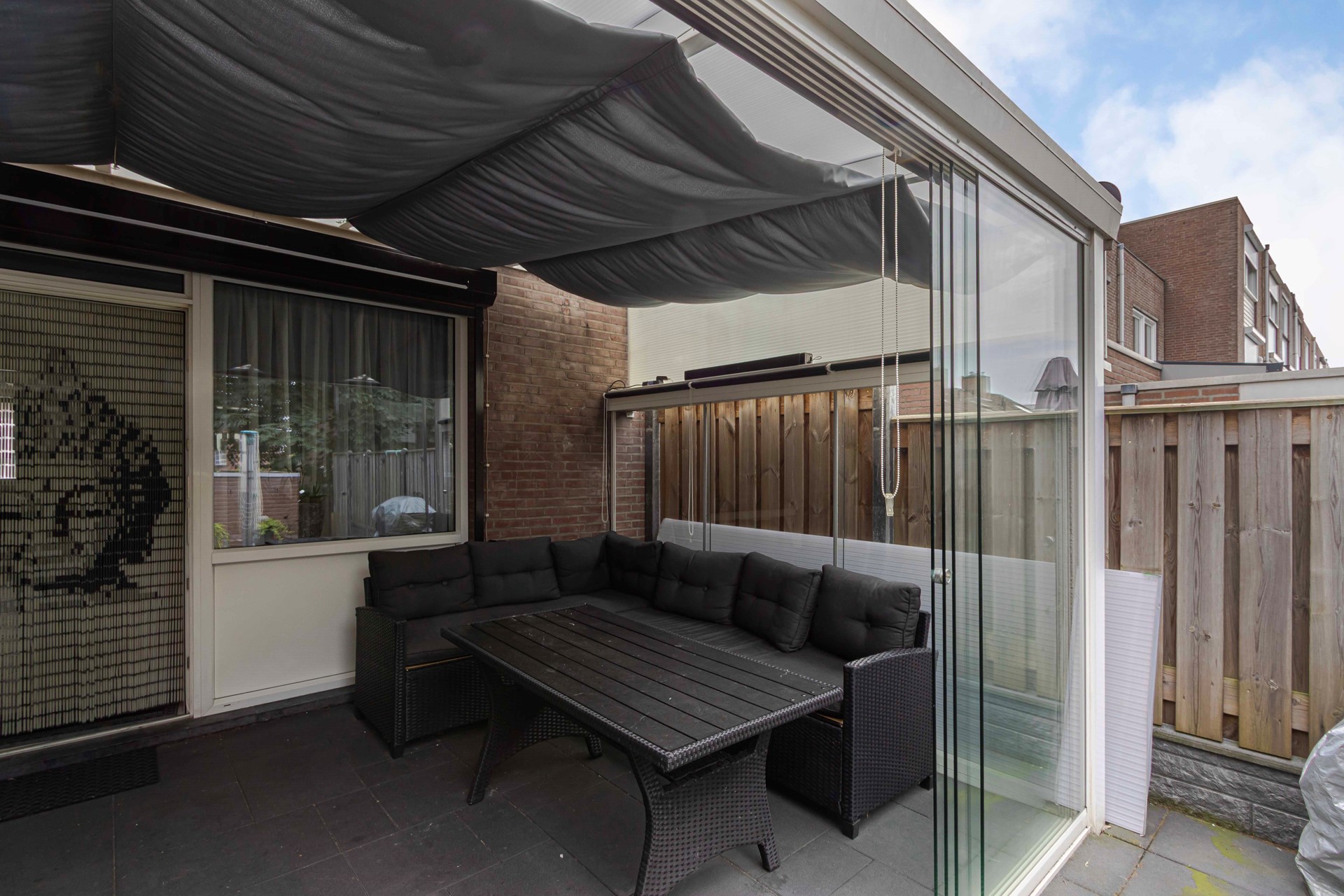 De tuin is voorzien van een achteringang en een praktische berging. Aansluitend aan de woning bevindt zich de serre met glaswanden, die een fijne overgang vormt tussen binnen en buiten en in elk seizoen een comfortabele plek biedt om te zitten. Een onderhoudsvriendelijke tuin met volop mogelijkheden.