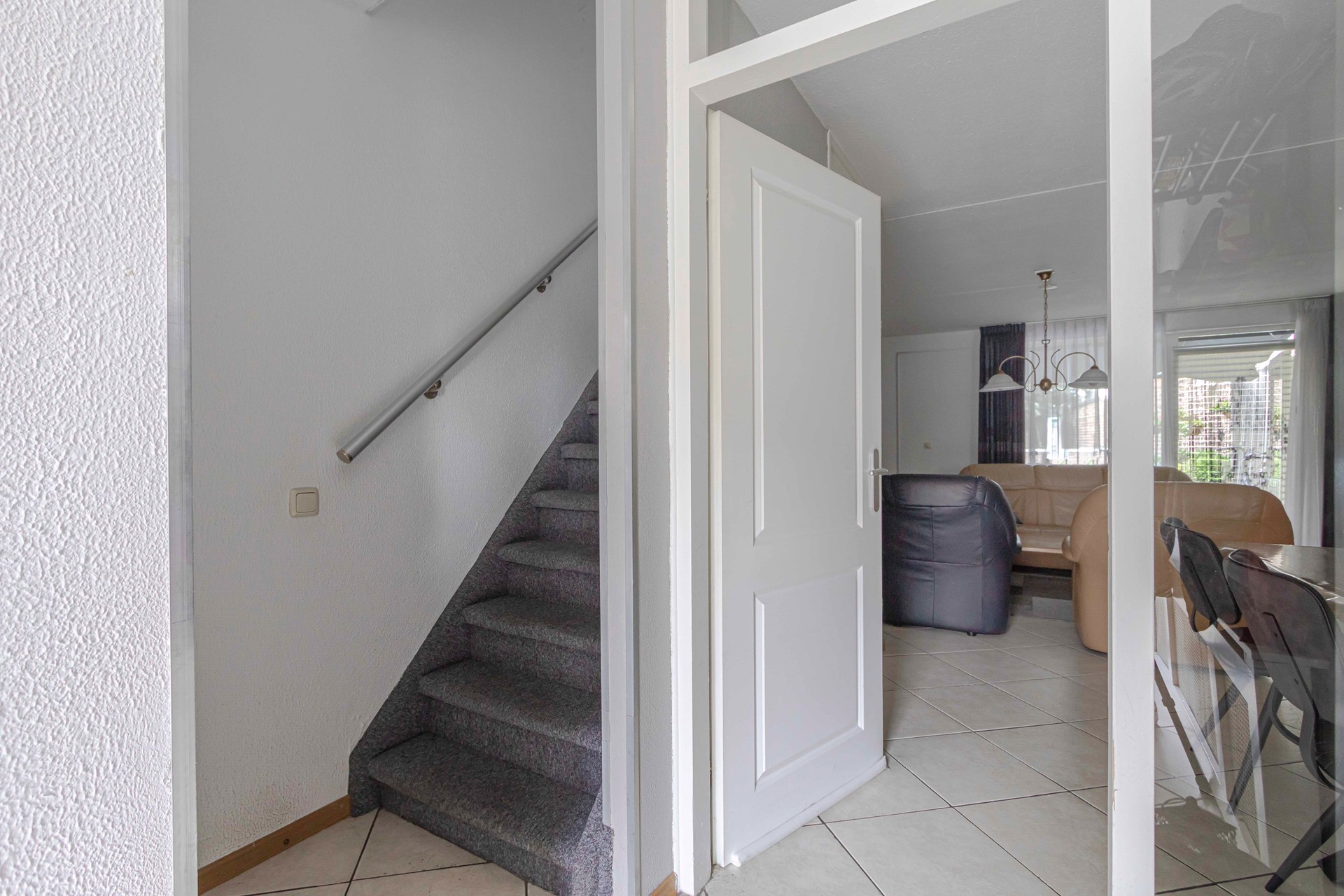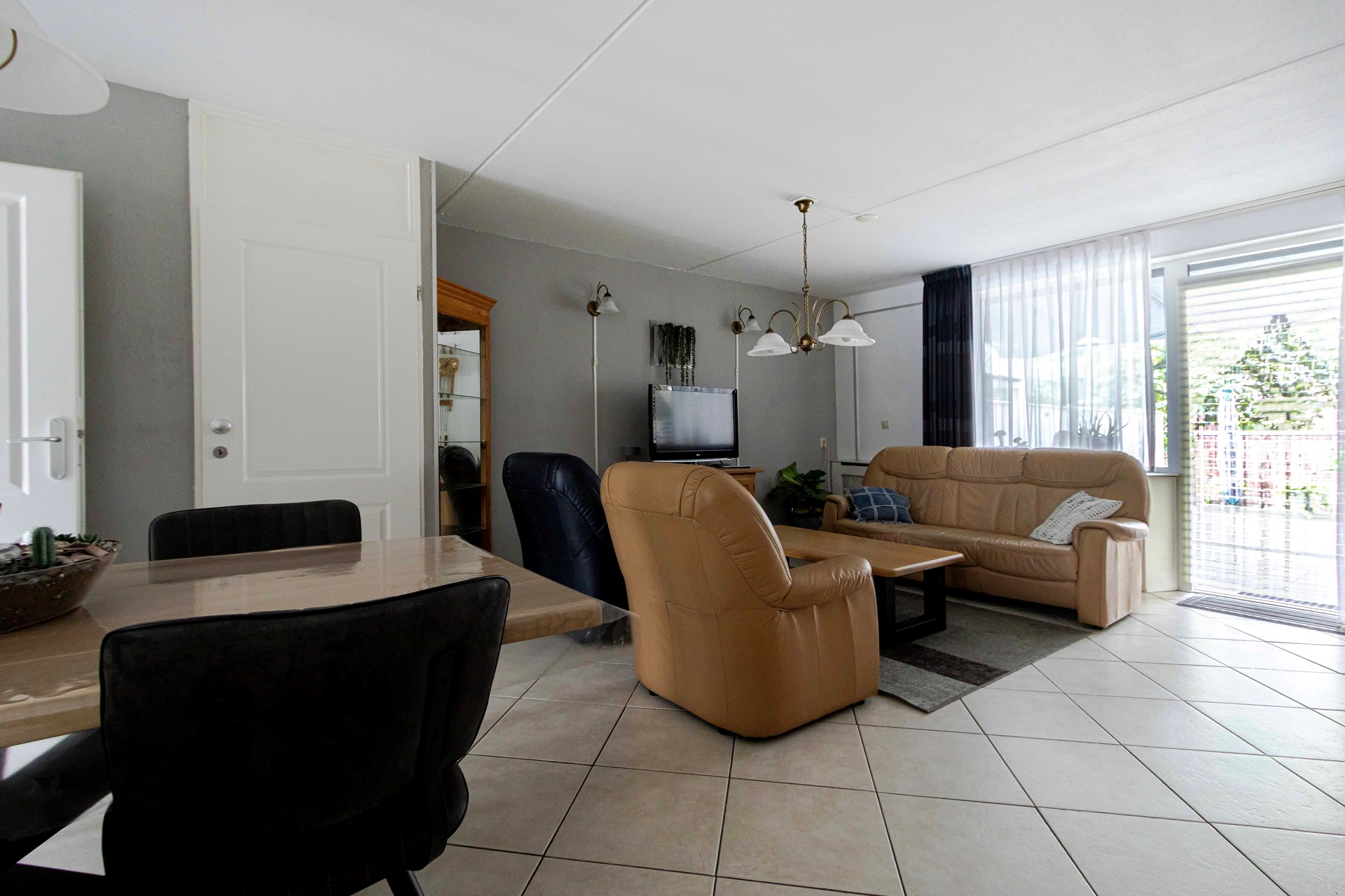We lopen door naar de ruime woonkamer, waar direct opvalt dat de tegelvloer doorloopt over de volledige begane grond. Dit zorgt voor een rustige, ruimtelijke uitstraling. Vanuit de woonkamer is er toegang tot zowel de keuken, de serre als de handige trapkast.