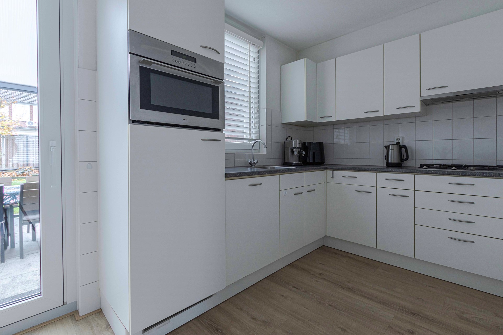 Aansluitend ligt de open keuken in hoekopstelling, voorzien van een 4-pits gaskookstel, afzuigkap, koelkast, vaatwasser en combi-magnetron. Via de moderne schuifpui in de woonkamer is de achtertuin met overkapping bereikbaar.