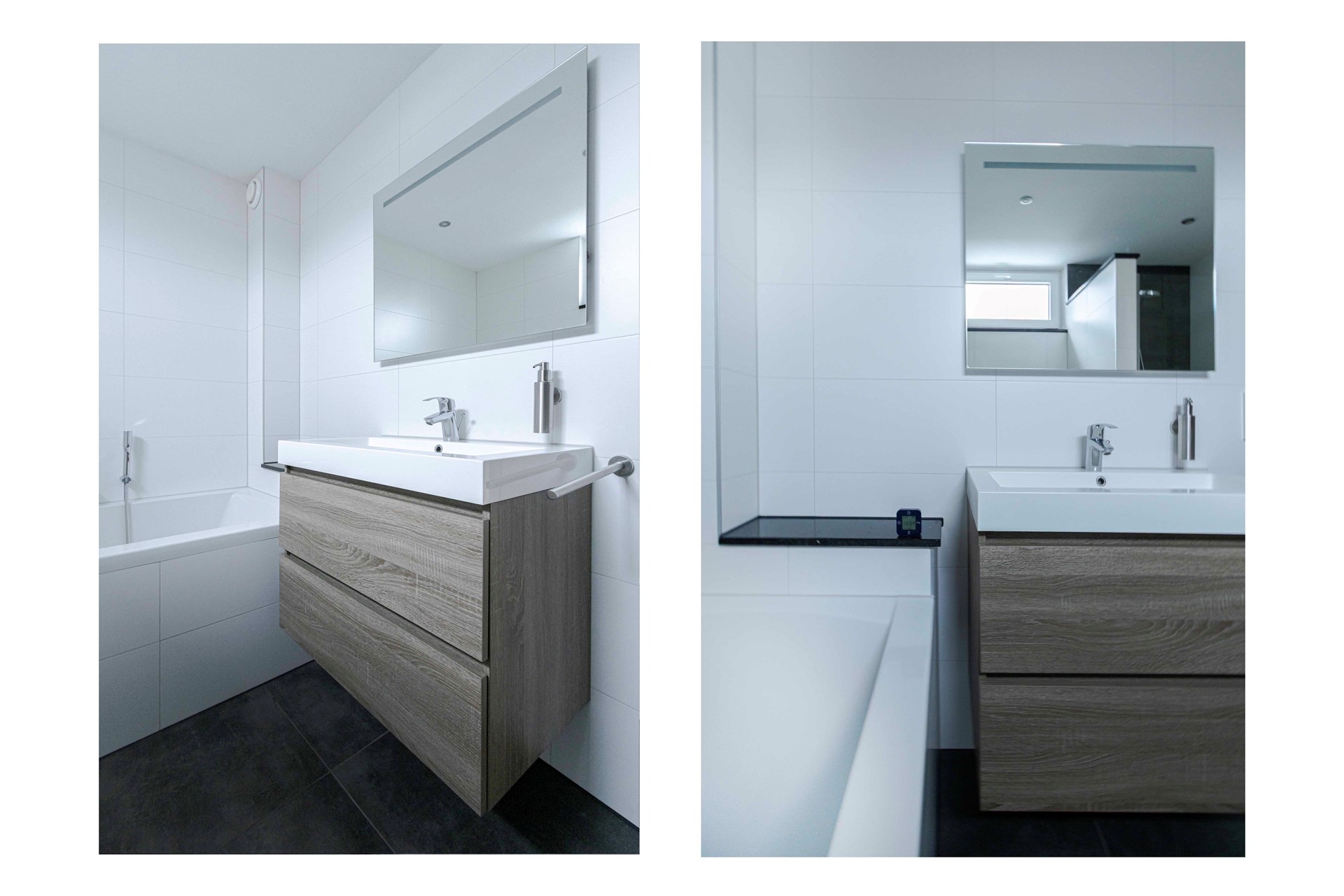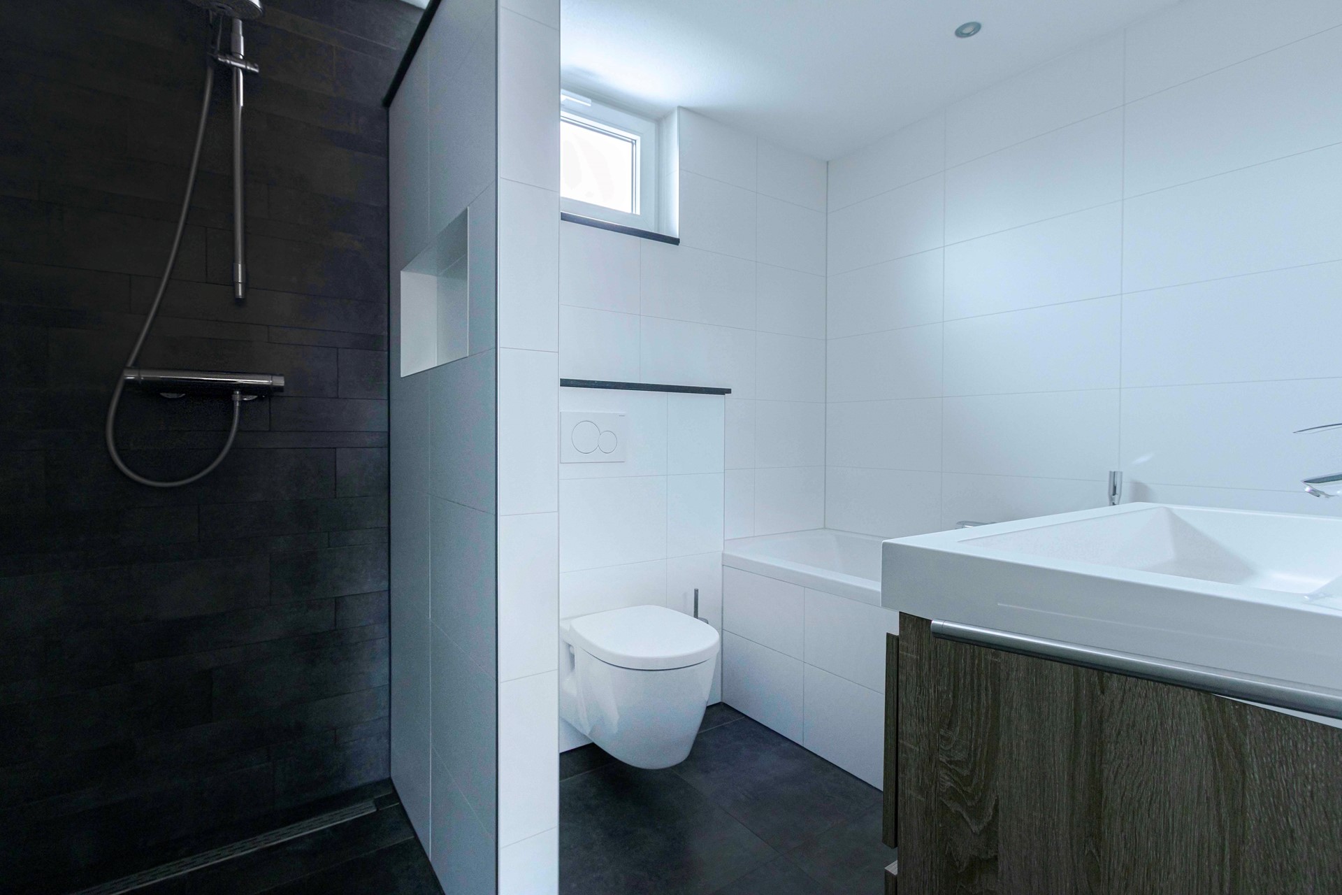De badkamer is modern en compleet uitgevoerd met een ligbad, inloopdouche, wastafelmeubel en een tweede toilet. Dankzij het aanwezige raam heeft de ruimte prettig daglicht en natuurlijke ventilatie.
