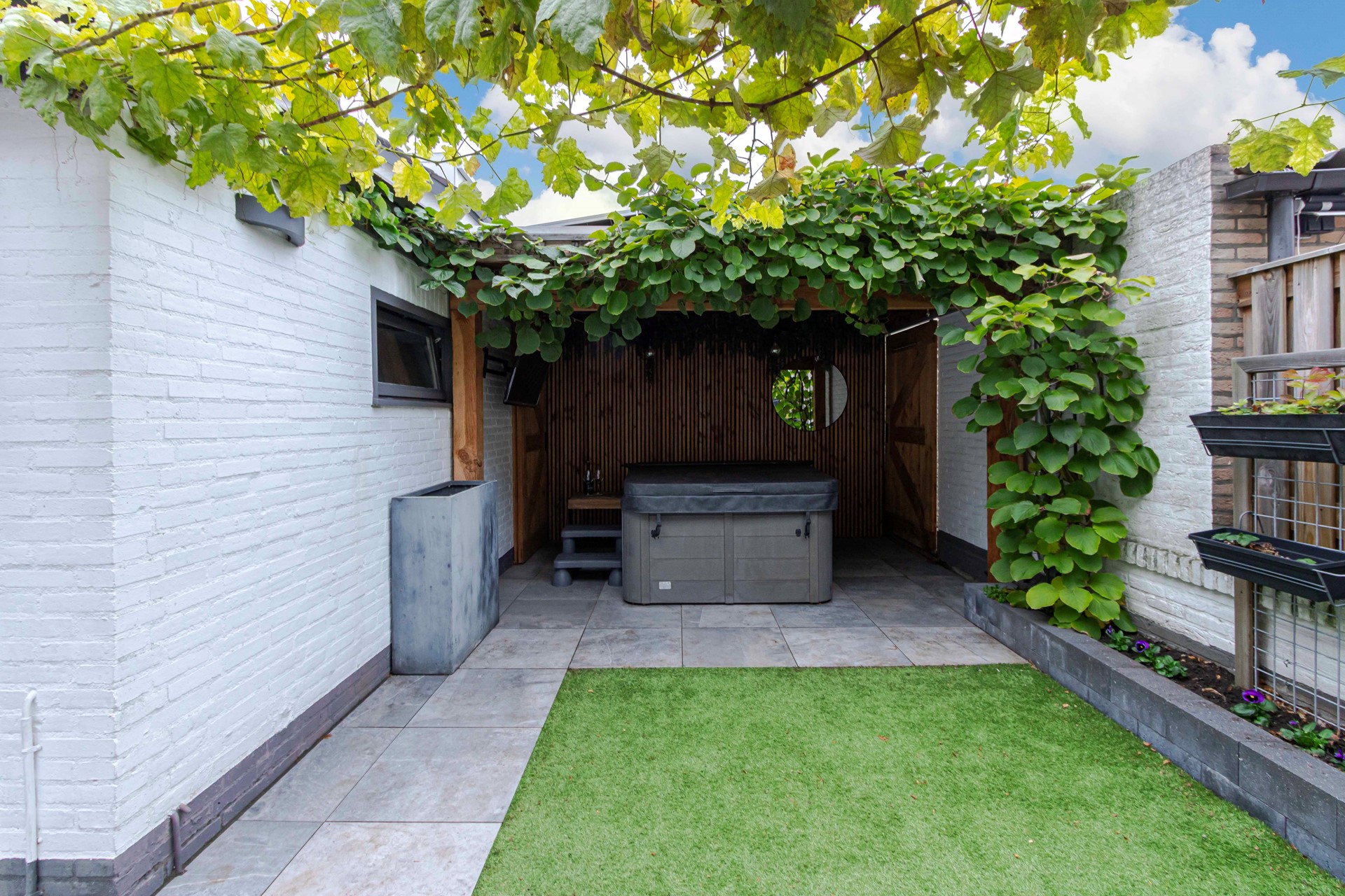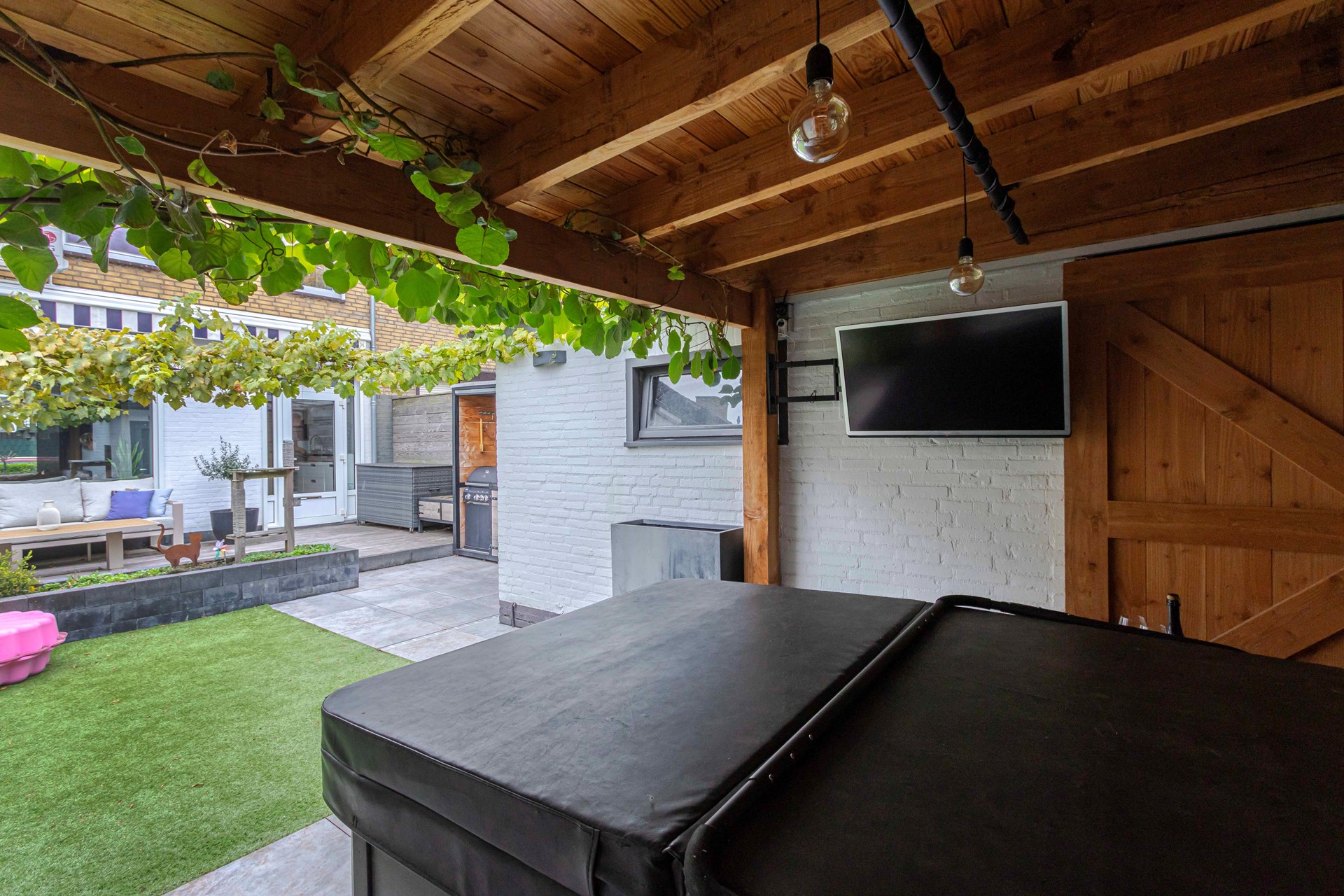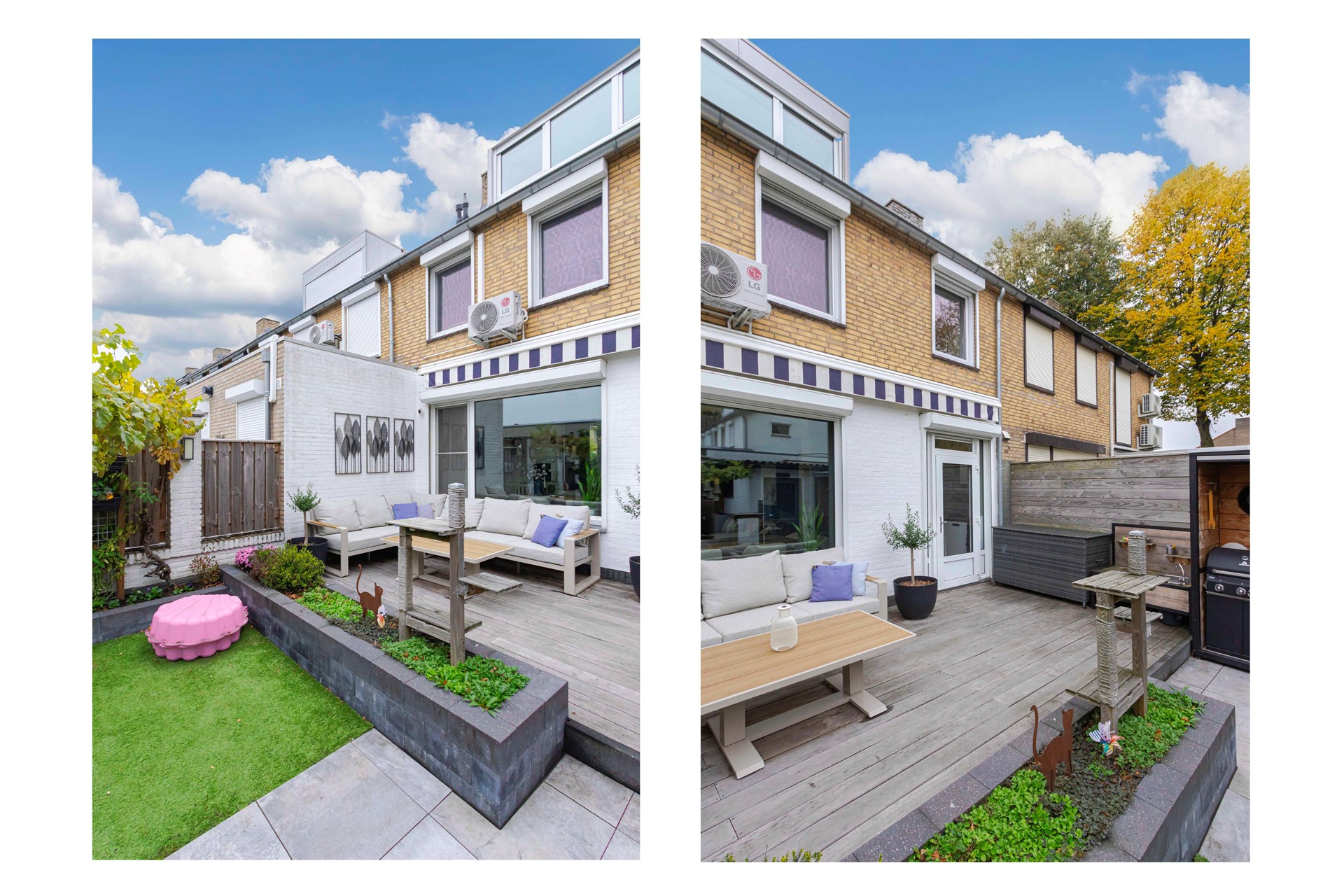 De gezellige achtertuin is gelegen op het westen en sfeervol ingericht. De tuin heeft een houten overkapping en een houten vlonder, gecombineerd met een gedeeltelijk betegeld en deels grasgedeelte. Daarnaast is er een zonnescherm aanwezig, ideaal voor zonnige dagen.