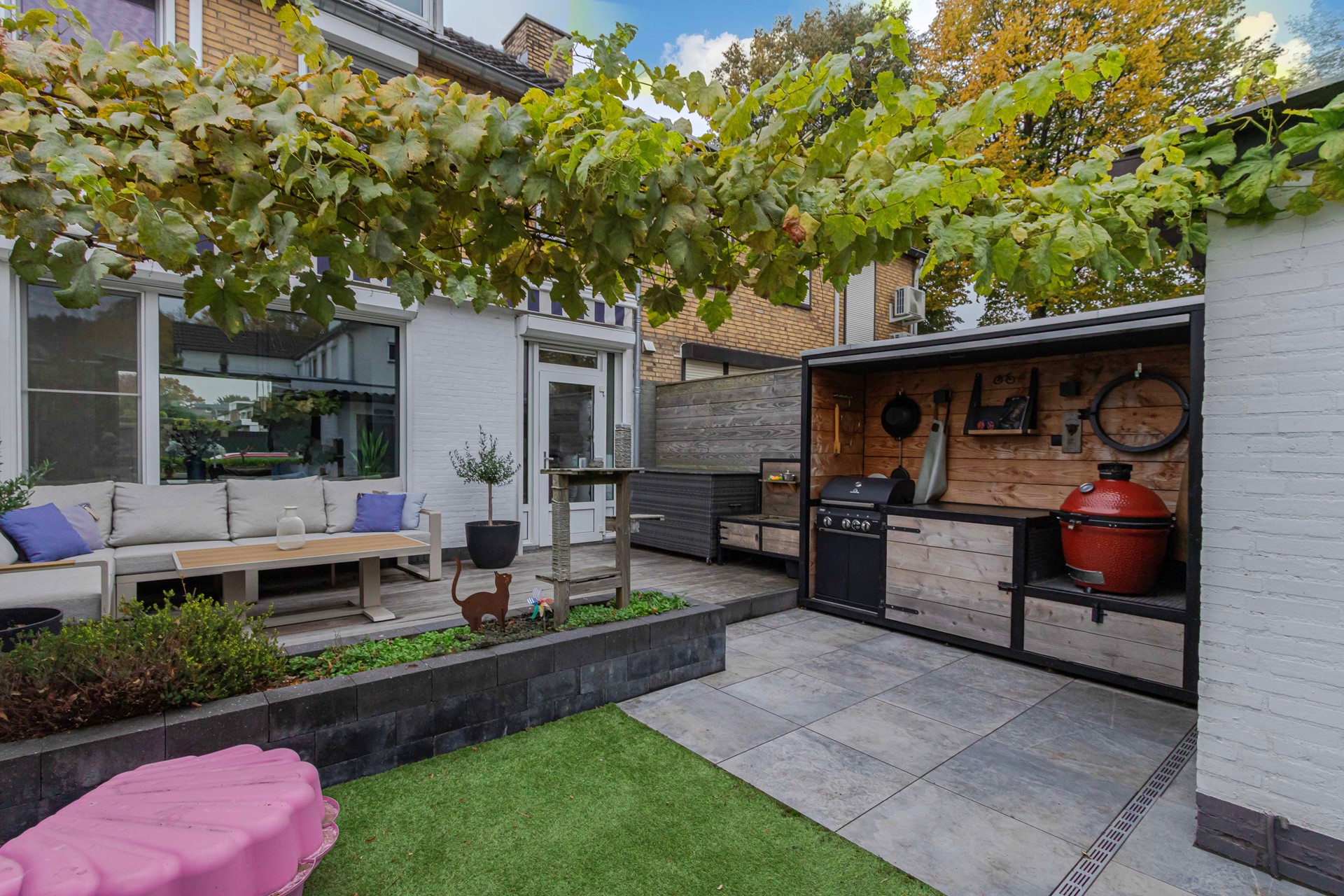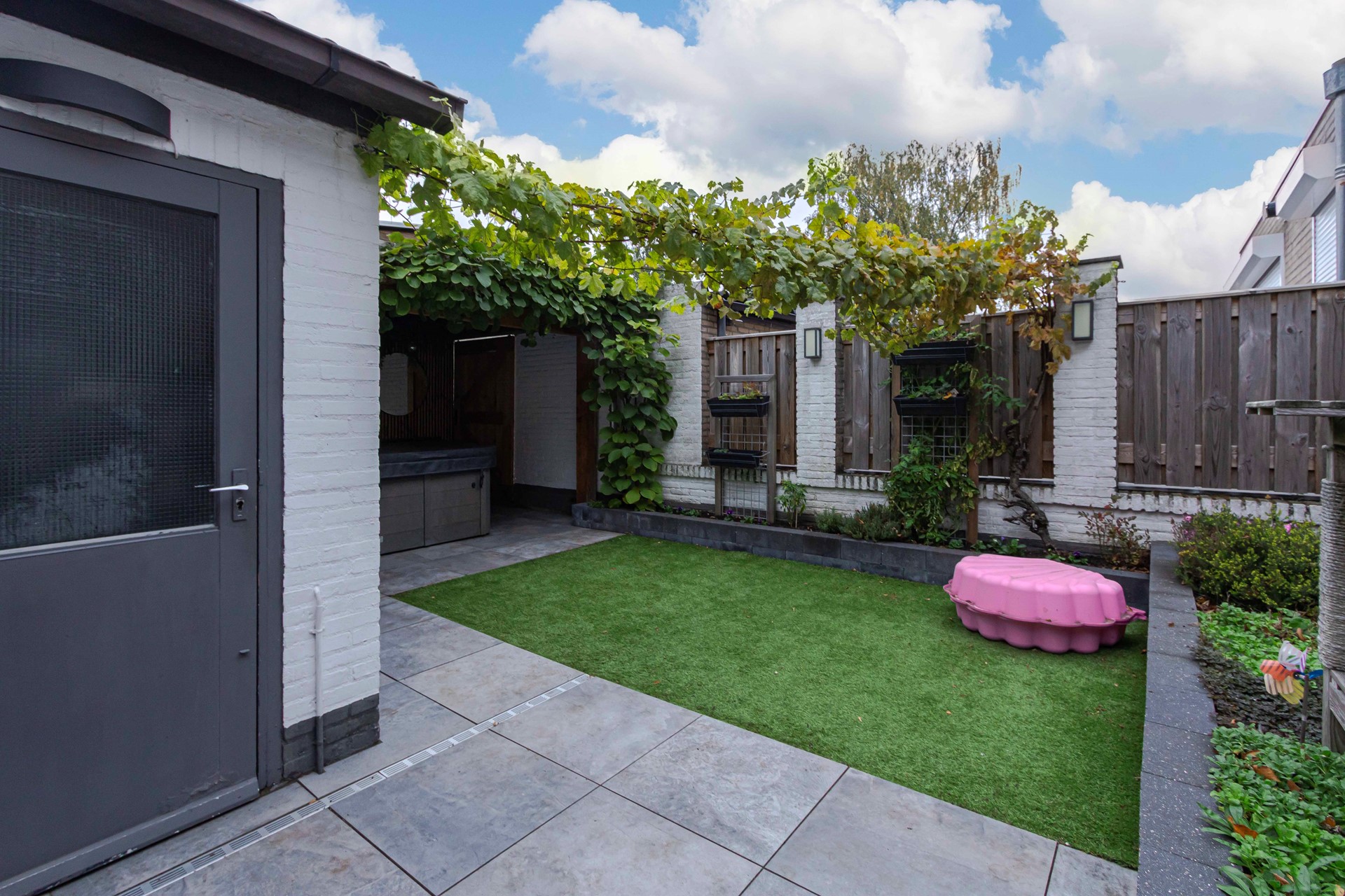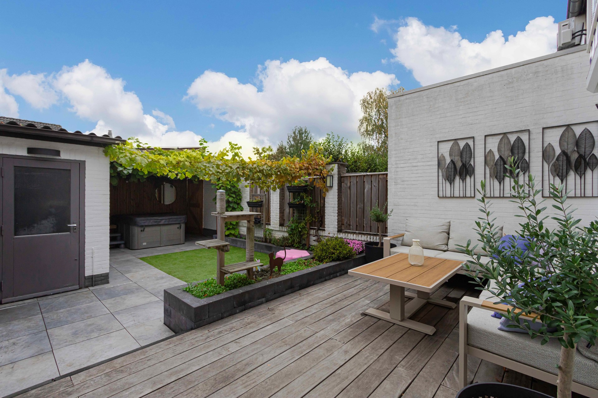 De gezellige achtertuin is gelegen op het westen en sfeervol ingericht. De tuin heeft een houten overkapping en een houten vlonder, gecombineerd met een gedeeltelijk betegeld en deels grasgedeelte. Daarnaast is er een zonnescherm aanwezig, ideaal voor zonnige dagen.