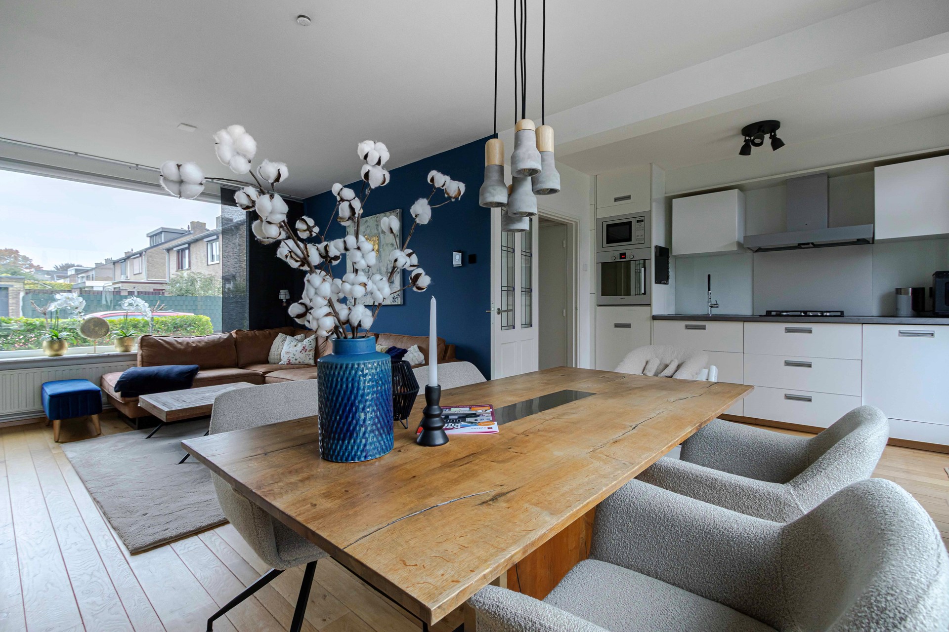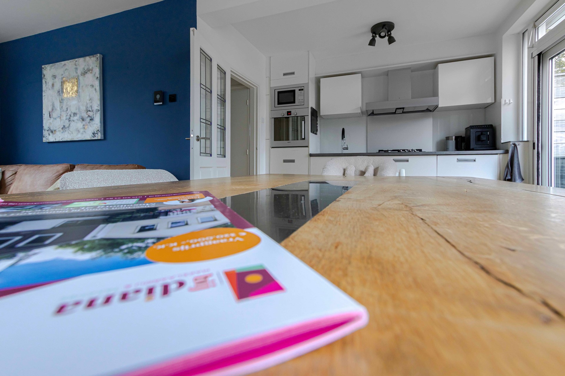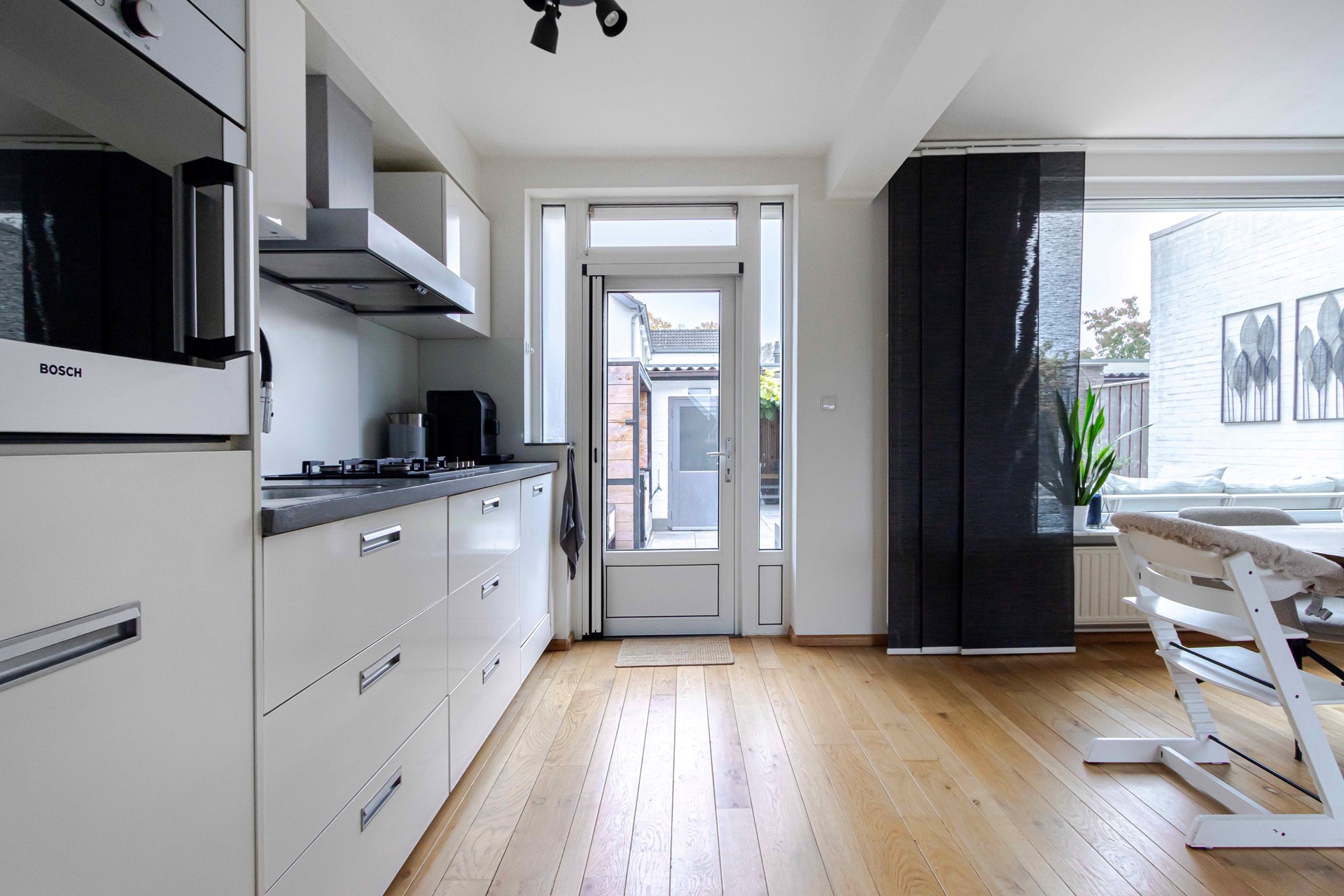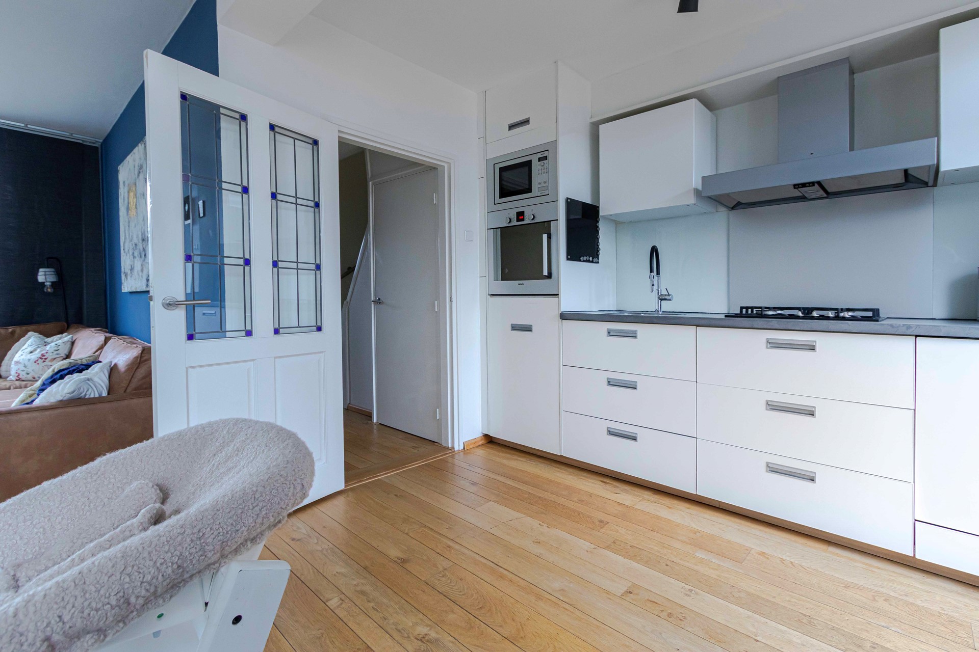 De open keuken is eveneens bereikbaar vanuit de hal en is uitgerust met diverse inbouwapparatuur, waaronder een 4-pits gaskooktoestel, afzuigkap, vaatwasser, koelkast, magnetron en oven. Vanuit de keuken is er directe toegang tot de achtertuin. De doorzonwoonkamer heeft een fijne lichtinval. Woonkamer en keuken samen hebben een oppervlakte van ca. 32 m².