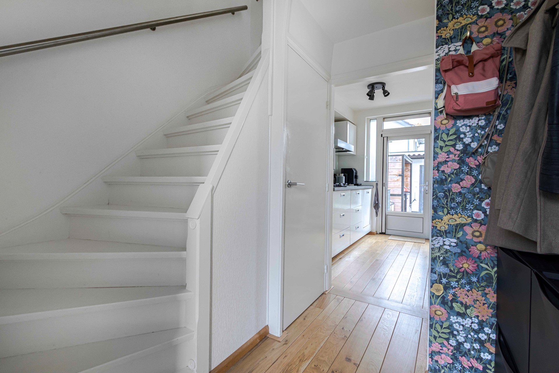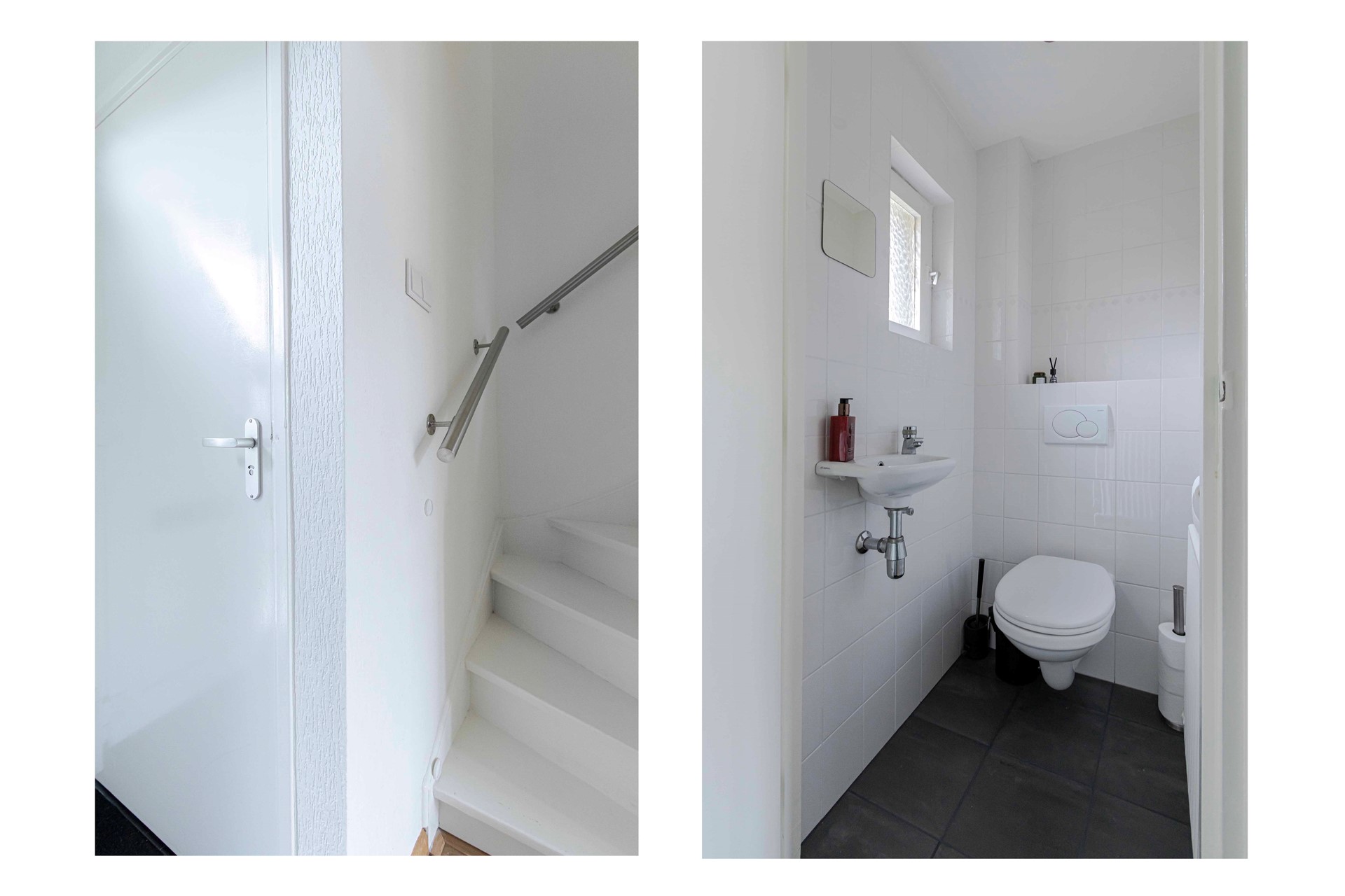 Via de entree kom je de woning binnen. Wat direct opvalt, is de mooie, lichte houten parketvloer die grotendeels is doorgelegd over de begane grond. Vanuit de hal is er toegang tot de meterkast, het moderne zwevende toilet met fonteintje en een raam voor natuurlijke lichtinval en ventilatie. Ook bevindt zich hier een praktische trapkast, ideaal voor extra voorraad of bergruimte.