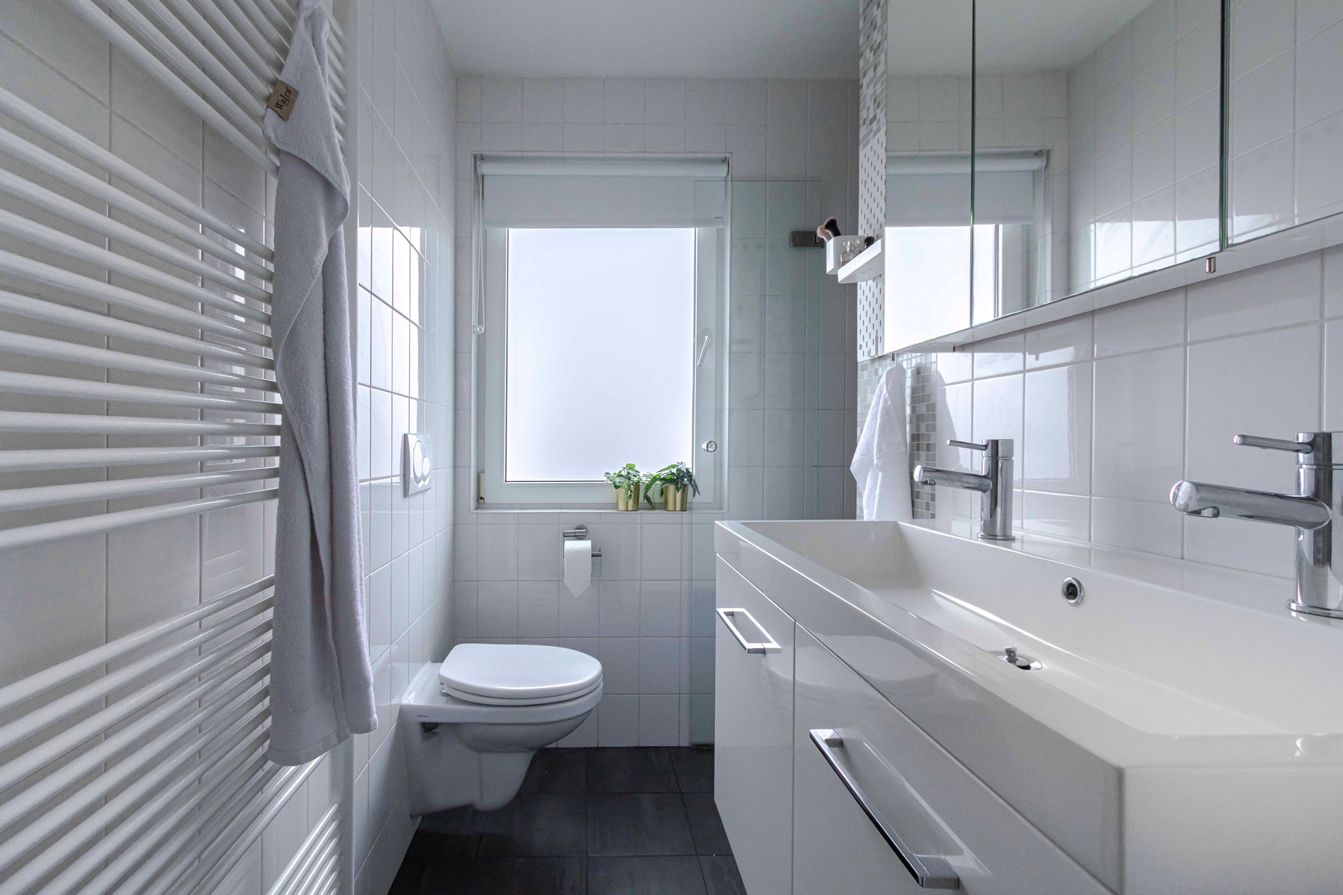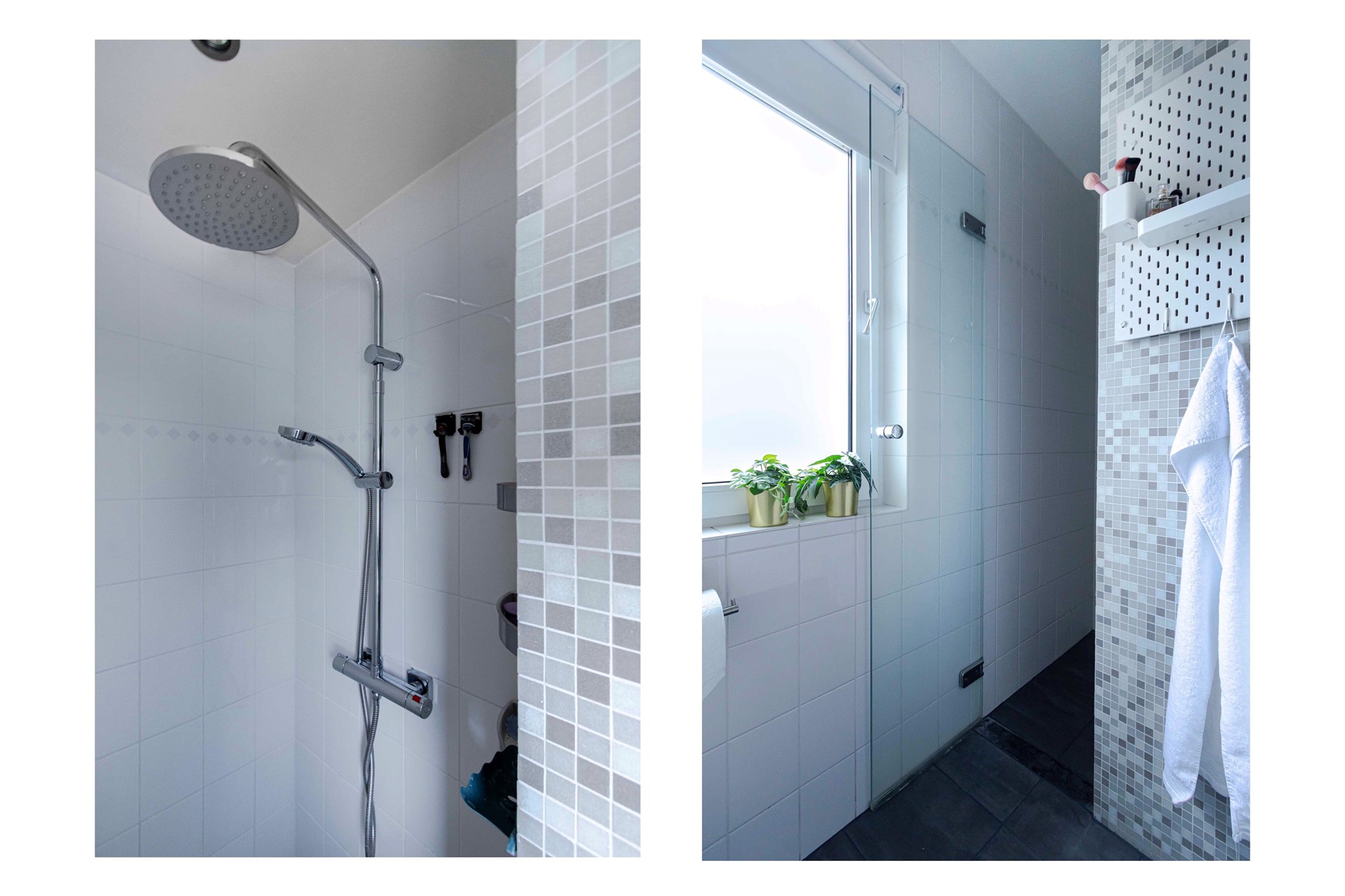 De badkamer is voorzien van een dubbele wastafel, een tweede toilet en een inloopdouche met glazen deur en regendouche. Een raam zorgt voor natuurlijk daglicht en goede ventilatie.