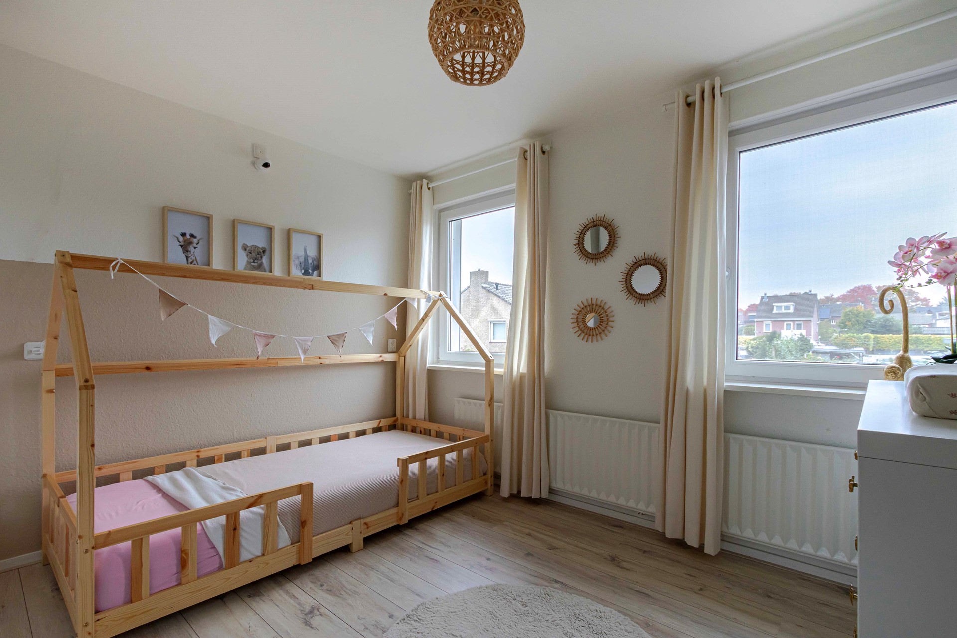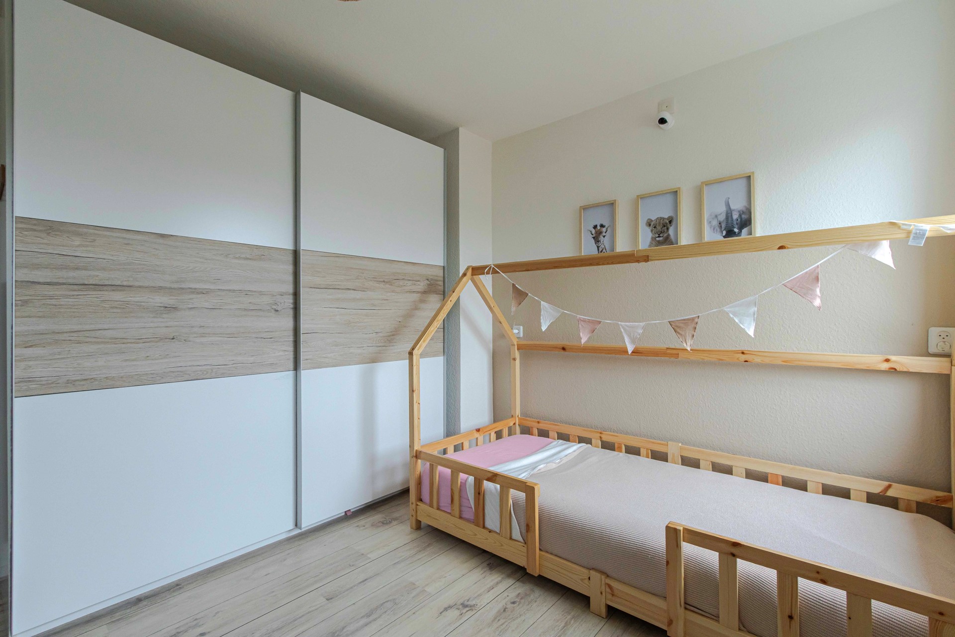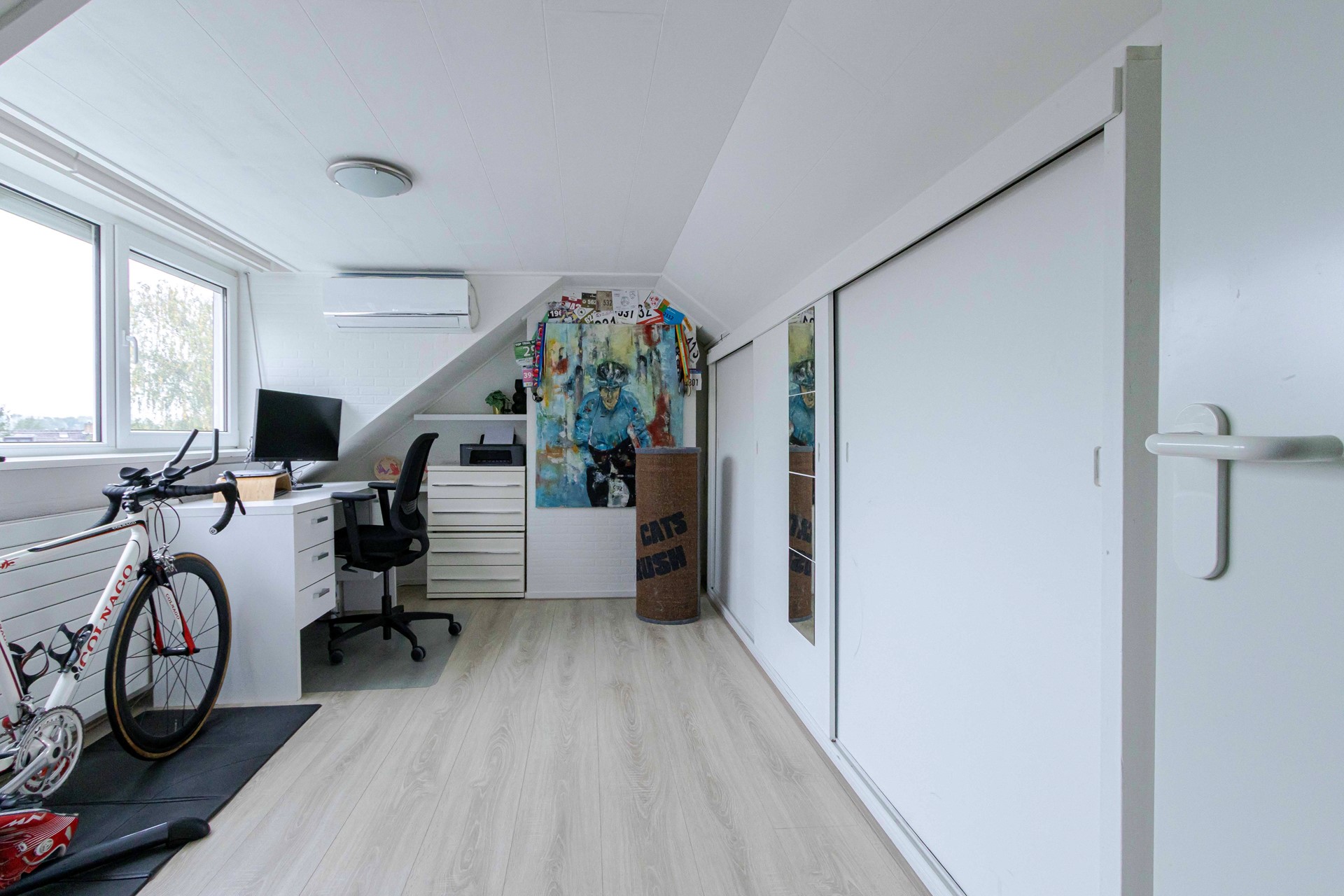 De derde slaapkamer is voorzien van een dakkapel, wat zorgt voor extra ruimte, comfort en veel natuurlijk daglicht. De kamer is mooi afgewerkt en beschikt over handige inbouwkasten en een airco. Met een oppervlakte van ruim 20 m² biedt deze slaapkamer volop ruimte.