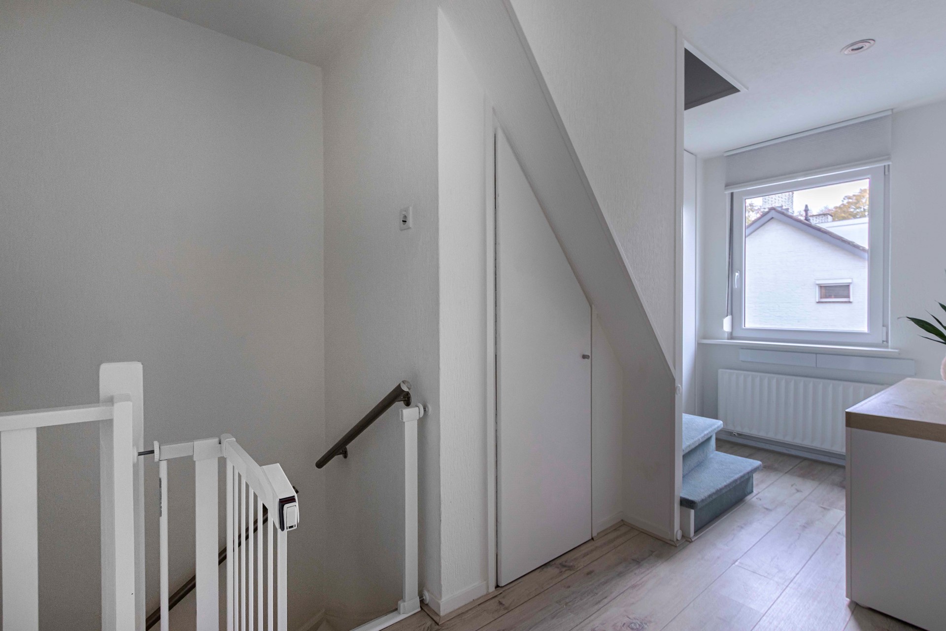 Via de trapopgang bereiken we de overloop van de eerste verdieping. Hier bevinden zich drie praktische bergkasten, ideaal voor extra opbergruimte. Vanaf de overloop zijn twee ruime slaapkamers en de badkamer bereikbaar.