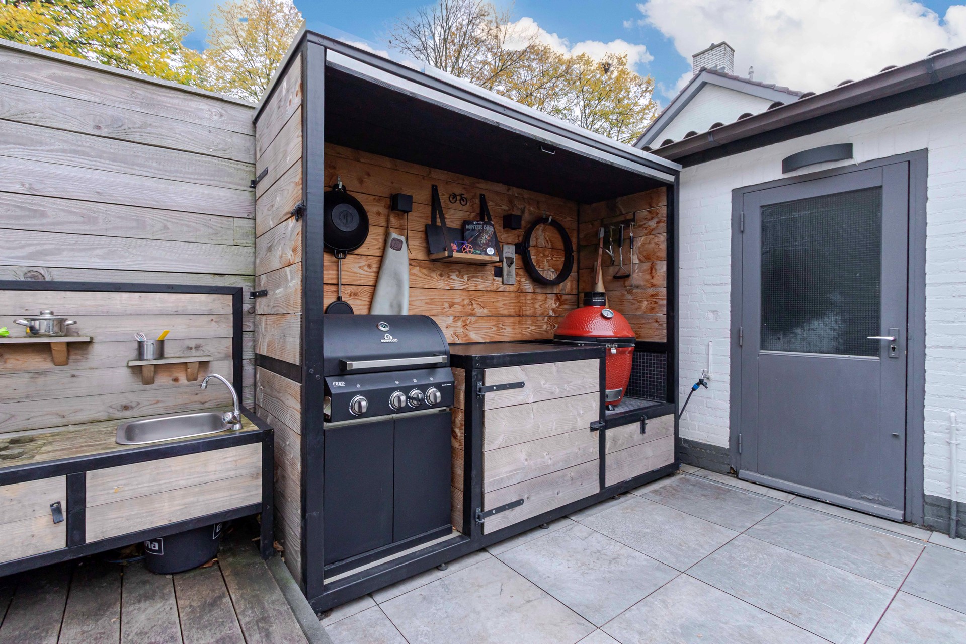 De berging van ruim 12 m², toegankelijk via de tuin, is praktisch ingericht en voorzien van de wasmachineaansluiting.