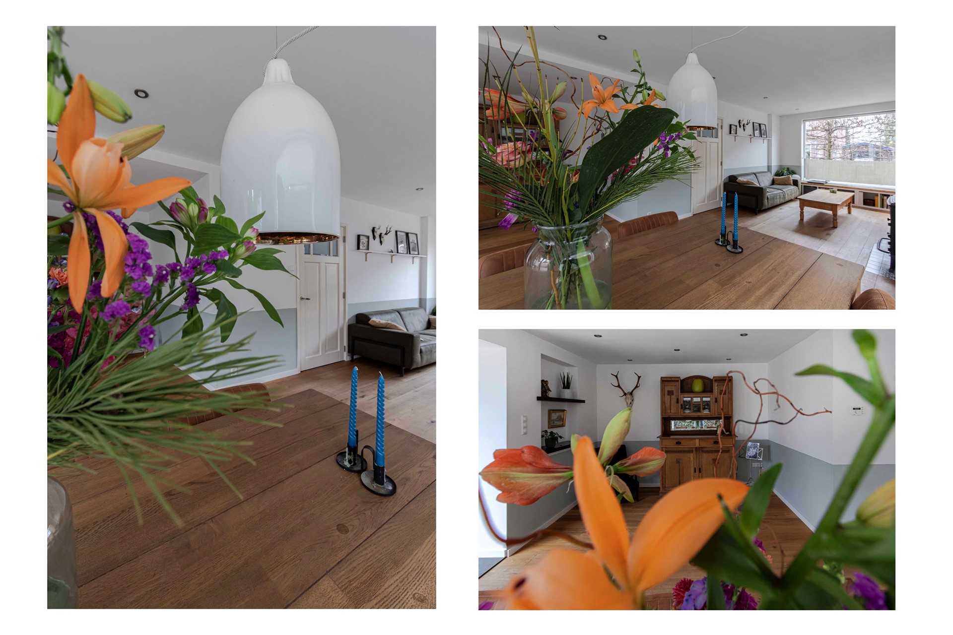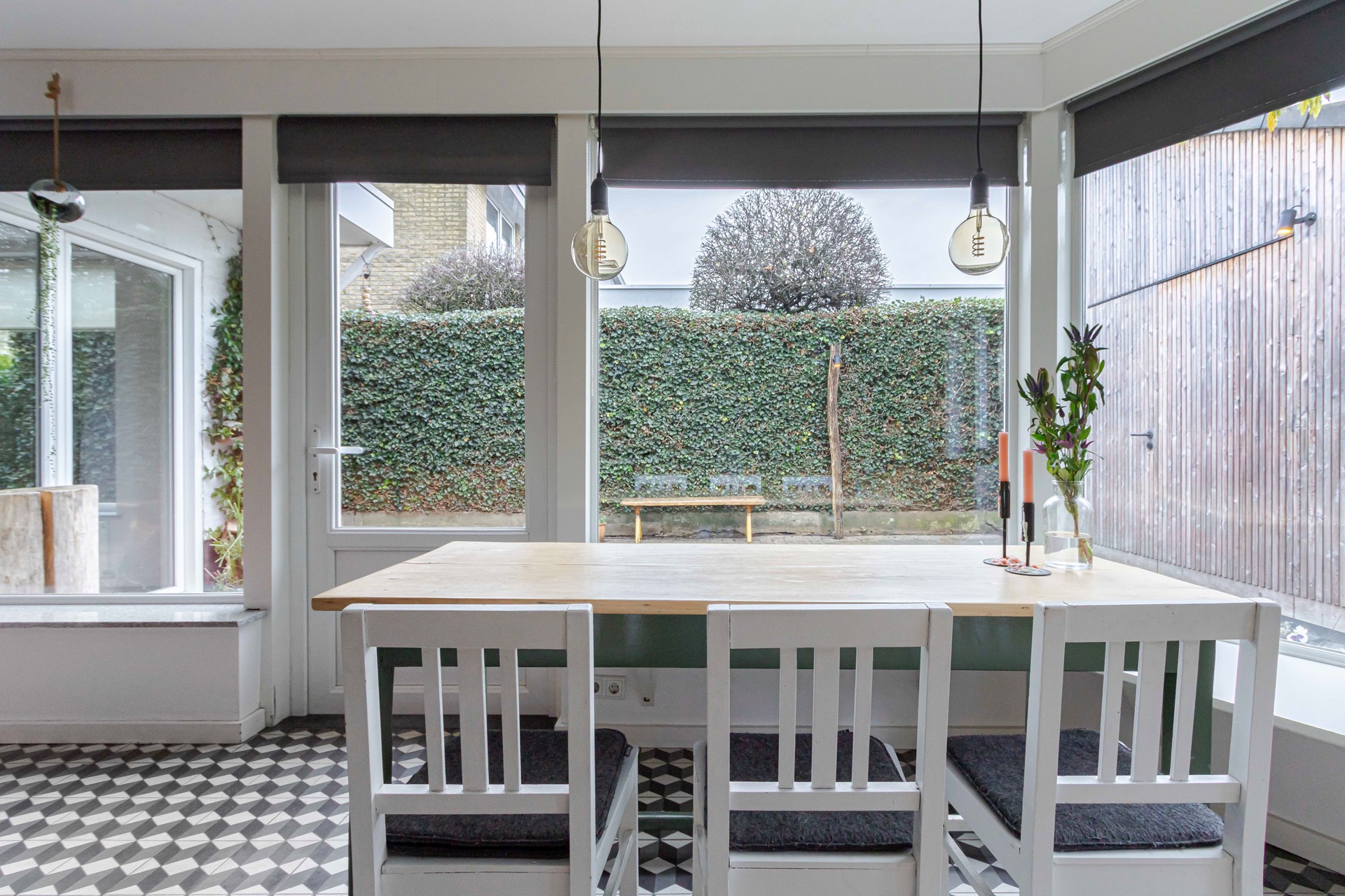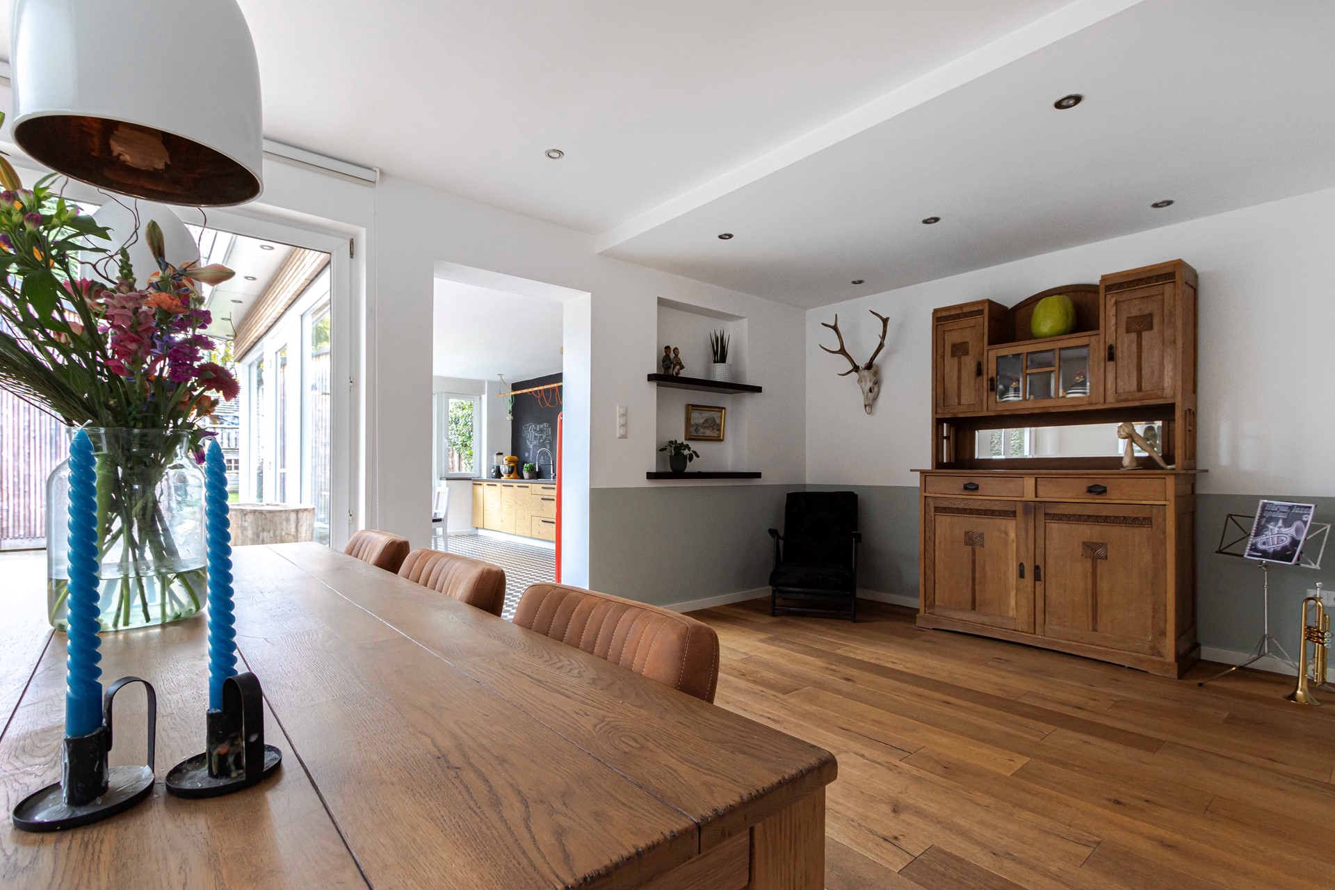 De L-vormige woonkamer van circa 38 m² voelt licht en ruim aan, met een houten vloer (toplaag hout) die samen met de vloerverwarming voor aangename warmte zorgt. De houtkachel vormt een gezellig middelpunt voor de koudere maanden. Vanuit de woonkamer geven openslaande deuren toegang tot de groene, privacyrijke tuin. De paneeldeuren en de fraaie trapopgang versterken de authentieke sfeer.