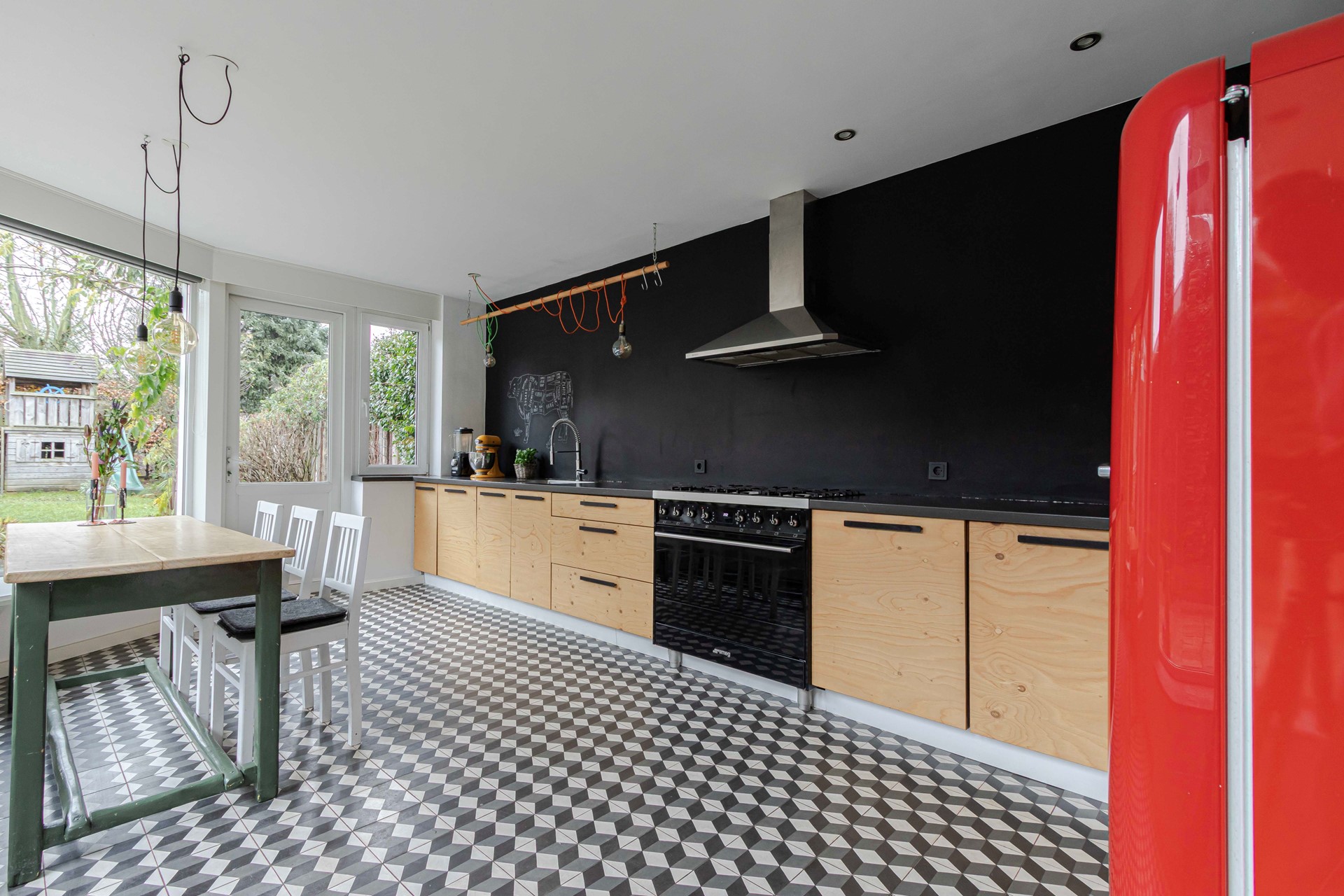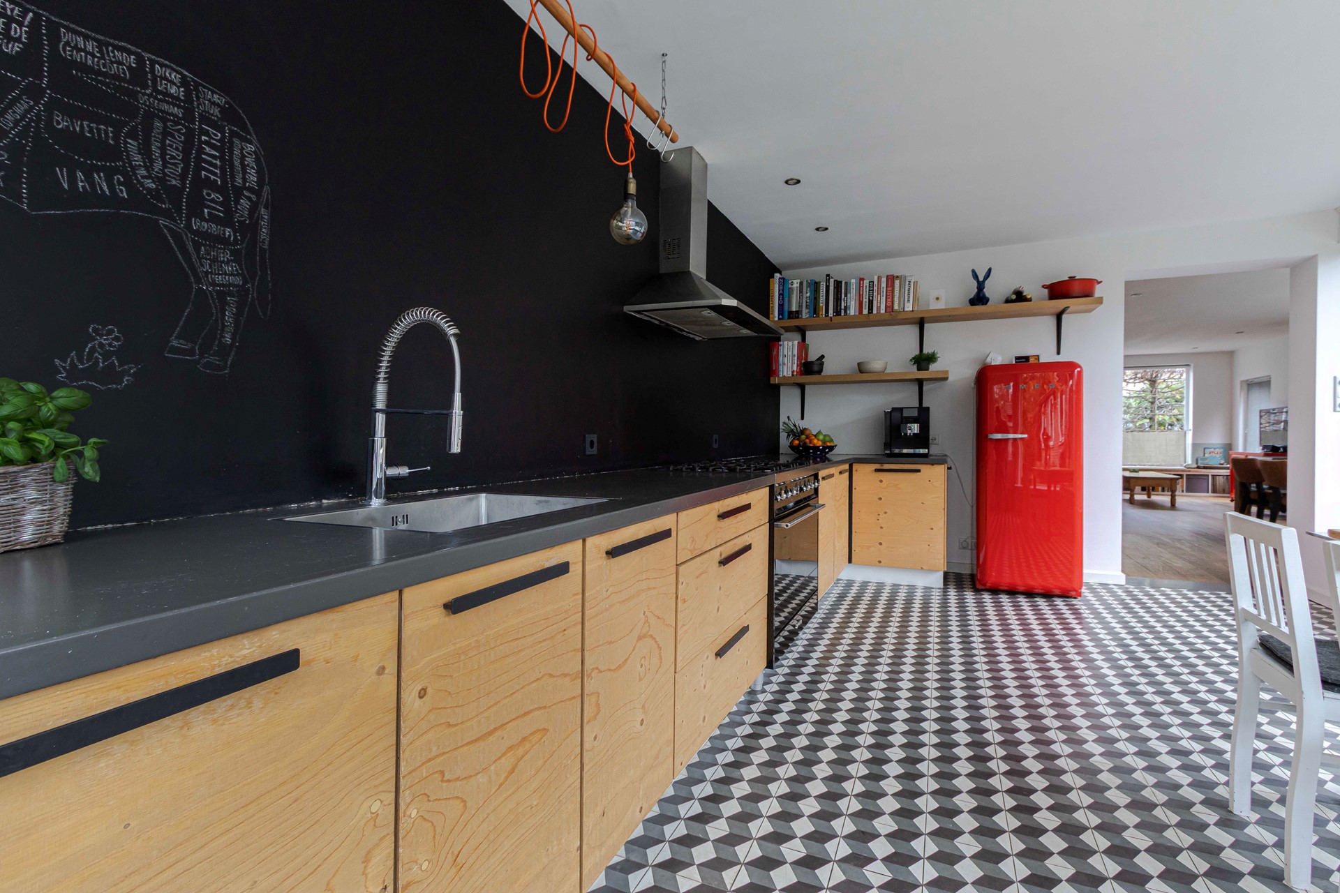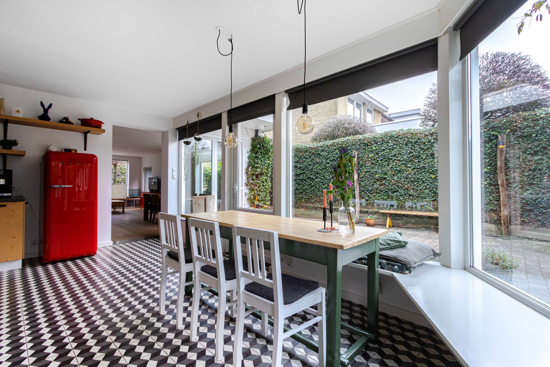Aansluitend ligt de leefkeuken van ruim 17 m², praktisch ingericht met een tegelvloer en een rechte keukenopstelling. Hier vind je een 6-pits kooktoestel met afzuiging, een vaatwasser, een SMEG-oven en een close-in boiler. De keuken kijkt prettig uit over de achtertuin, waardoor koken en wonen naadloos in elkaar overlopen.