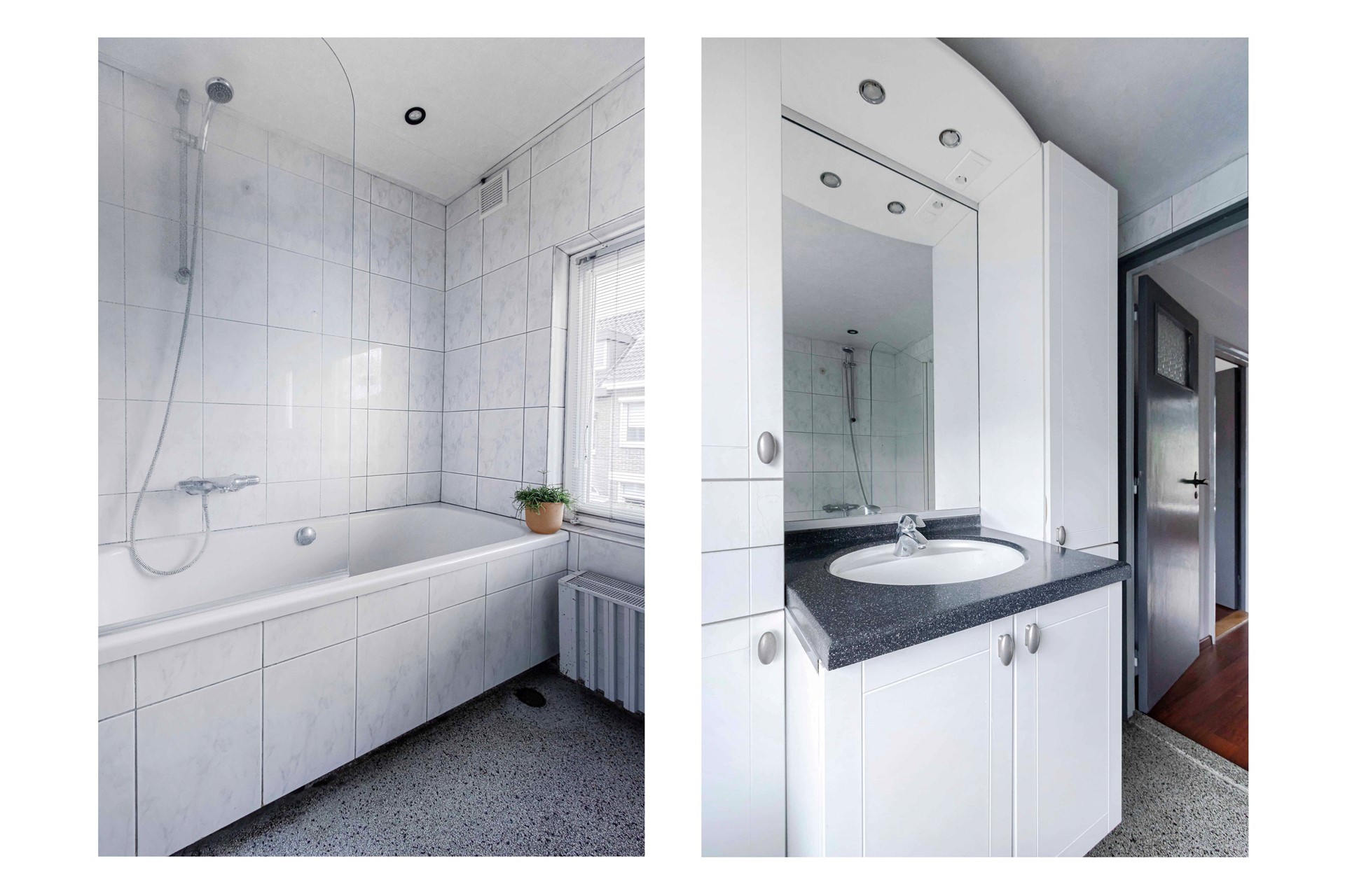 De fraaie trapopgang leidt naar de eerste verdieping, waar de overloop toegang geeft tot drie slaapkamers en de badkamer. Deze badkamer heeft een authentieke terrazzovloer en is voorzien van een wastafelmeubel en een bad-douchecombinatie. Hoewel functioneel, is modernisering wenselijk om het comfort en de uitstraling naar het niveau van vandaag te brengen. Naast de badkamer bevindt zich op deze verdieping een separate toiletruimte