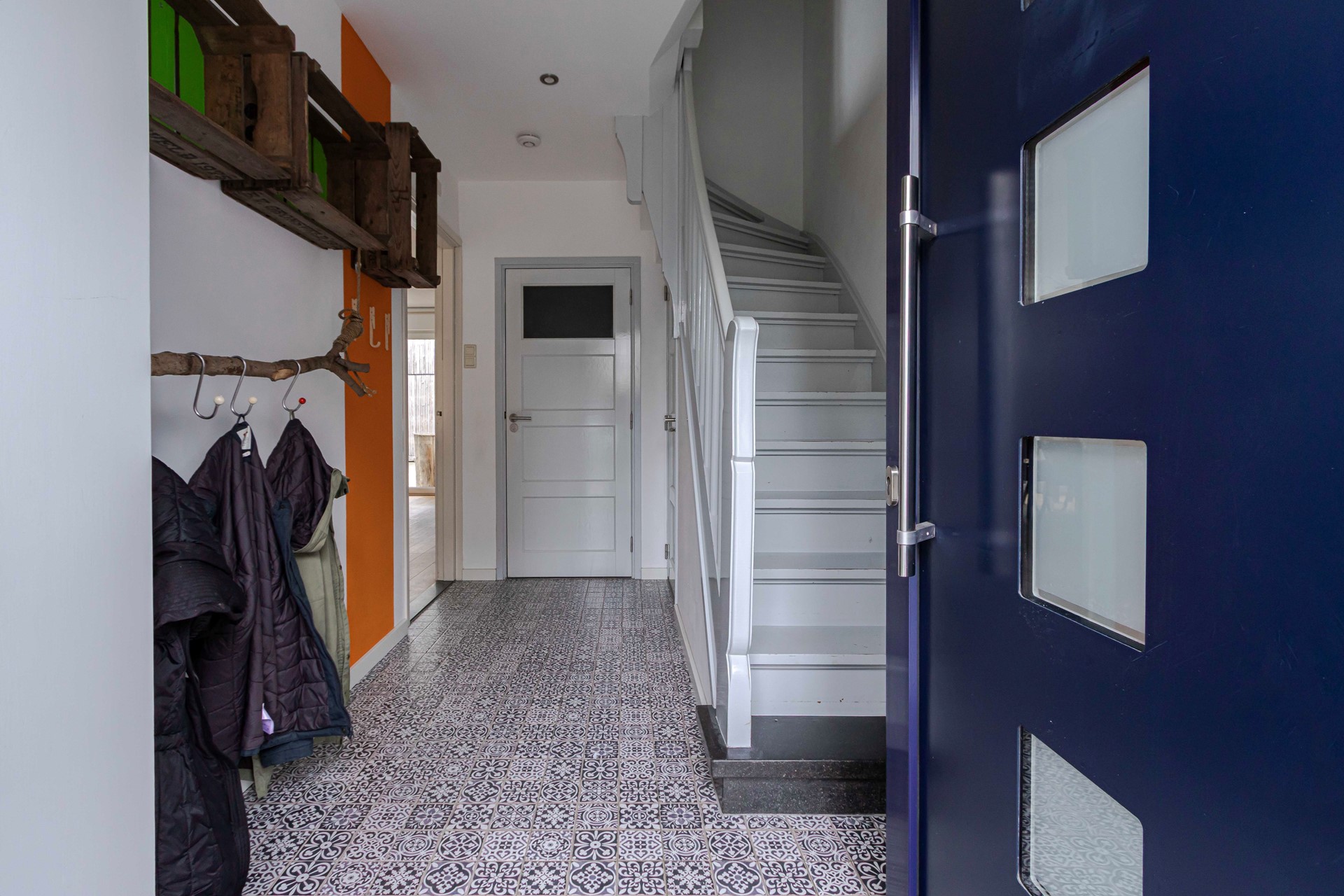 Bij binnenkomst valt direct de charmante hal op, afgewerkt met Portugese tegeltjes die de toon zetten voor de rest van het huis. Vanuit de hal zijn het modern afgewerkte toilet met zwevend closet en fonteintje, de kelder en de living bereikbaar.