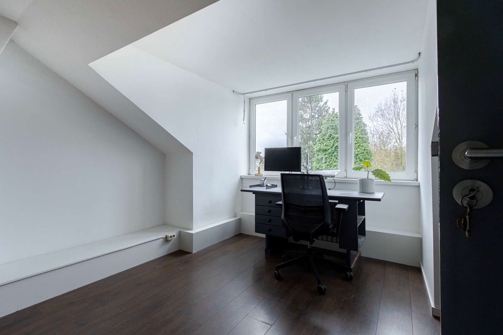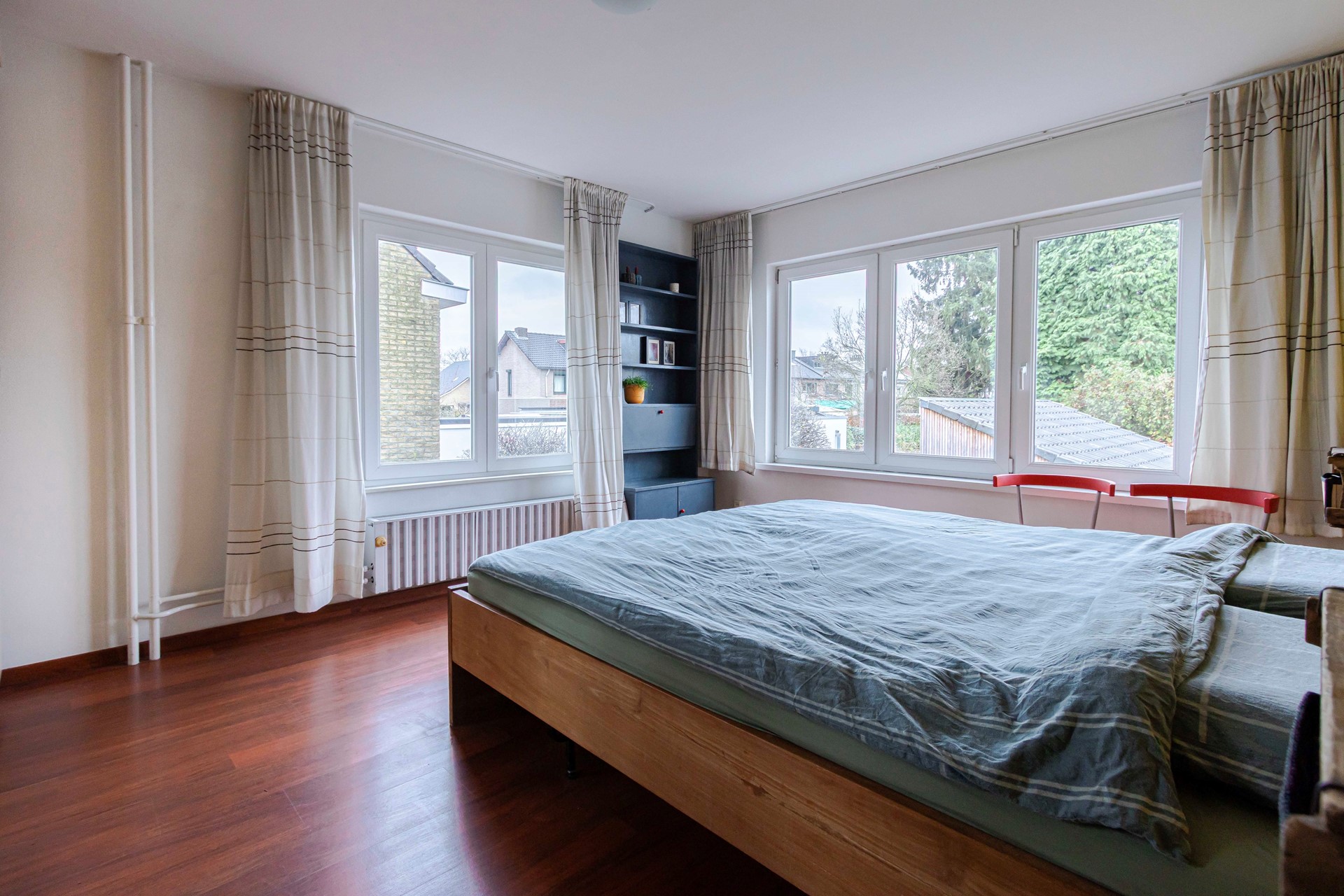 De slaapkamer aan de voorzijde (circa 12 m²) beschikt over een balkon. Aan de tuinzijde liggen twee slaapkamers: een royale kamer van circa 16 m² en een derde kamer van circa 8 m², ideaal als kinderkamer, werkkamer of dressing.